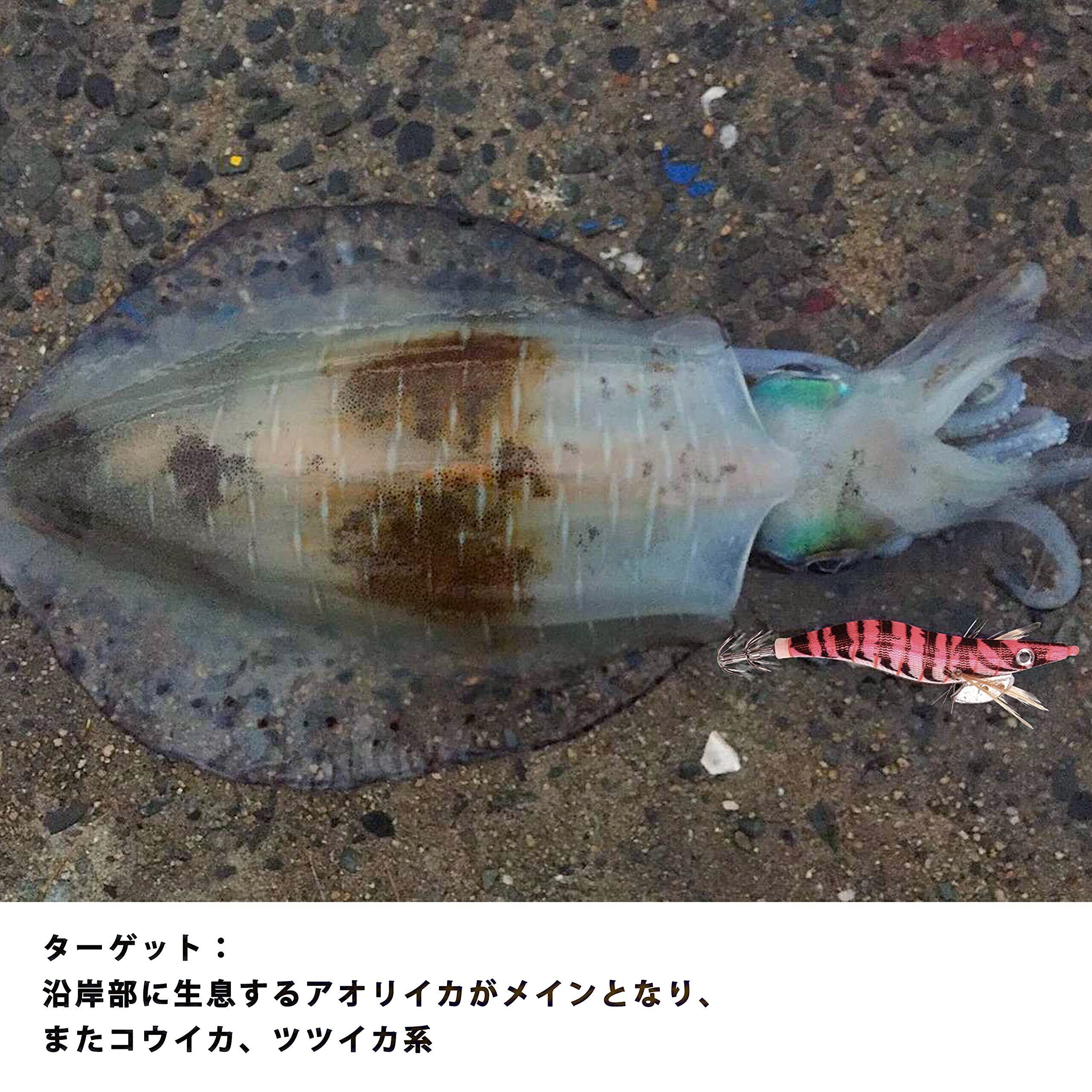 蛍光塗装:ナイト、ディープなど黒いところでも目標魚を引き付けるための蛍光塗装の夜光エギです。蛍光塗装部は頭部、テール部とフック部(身は日差しや電灯の光などに照らされた後に使用してください。)全身夜光ではないです。