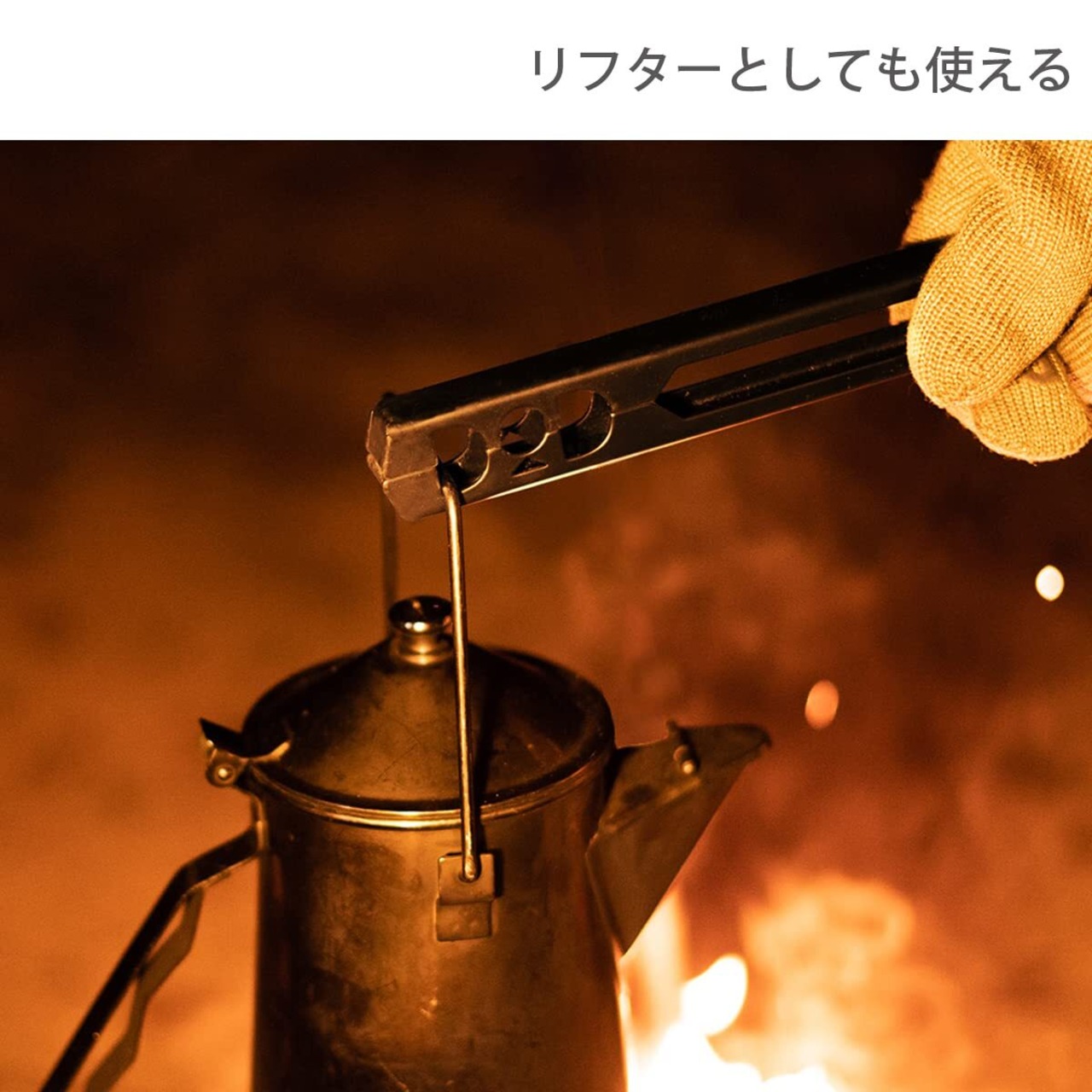 DODロゴでガッチリ掴むDODロゴを2つに分けたら、ギザギザがちょうど良い感じで、炭や薪が掴みやすい。細かいものも掴みやすい先端に平面があるので、小枝などの小さなものもピンポイントで掴めます。リフターとしても使える熱いケトルを持ち上げたり、クッカーのフタを開けたりできます。キャリーバッグ付き汚れを気にせず収納出来ます。