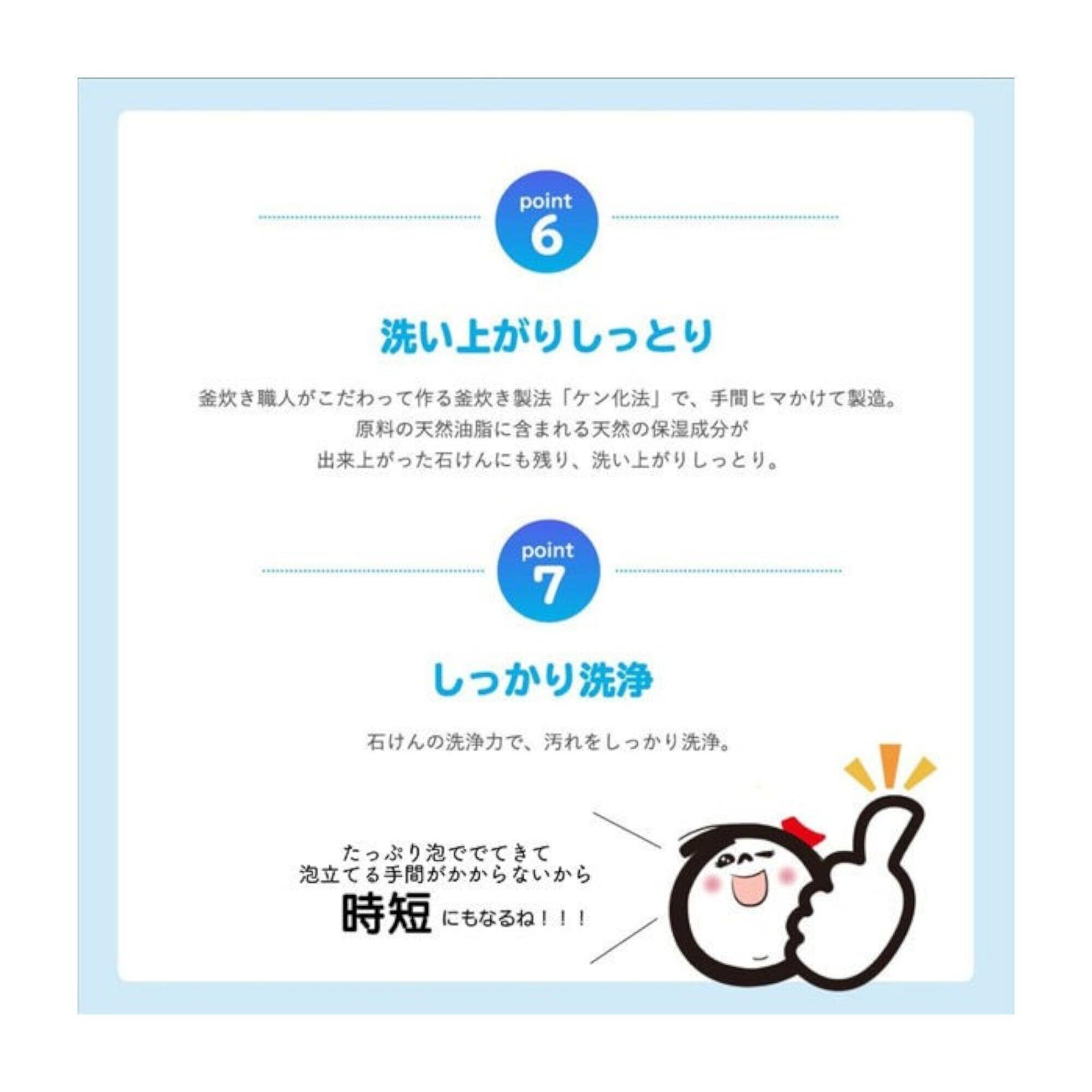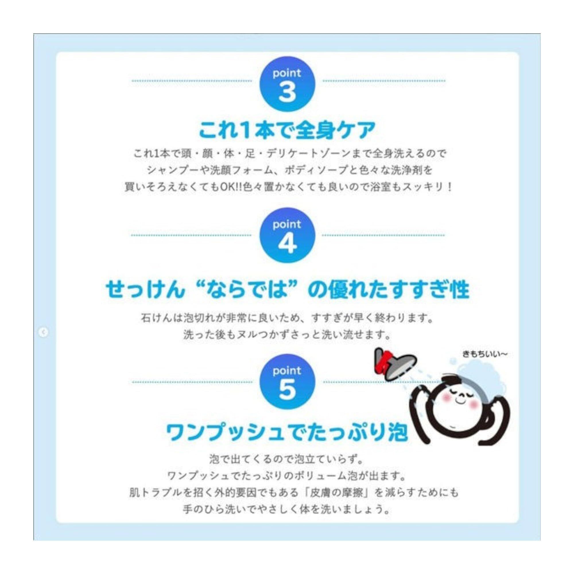 頭・顔・体・足・デリケートゾーン全部これ1つで洗っていただけるので、シャンプーや洗顔フォーム、ボディソープと色々な洗浄剤を買いそろえる必要もなくとても経済的です。 たっぷりのボリューム泡が出るので、 手のひら洗いでやさしく体を洗うことができます。 天然油脂をカリ石ケン素地の原料に使用し、釜炊き製法(ケン化法)でじっくり炊き上げて作りました。天然の保湿成分を含み、洗い上がりがしっとり。 清拭料(頭以外)としても使っていただけるので水洗いできない介護や災害、子どもの発熱などで入浴できない時にもおすすめです。 香料・殺菌剤・合成界面活性剤不使用。 皮ふアレルギーテスト済み・皮ふ刺激テスト済み (すべての方にアレルギーや刺激が起こらないということではありません) ●成分:水、カリ石ケン素地 【使用上の注意】 ●お肌に異常がないかよく注意して使用してください。お肌に傷、湿疹等異常のある時は使用しないでください。 ●お肌に合わないとき、使用中の赤み、はれ、かゆみ、刺激、色抜け(白斑等)や黒ずみ等の異常が出た時、直射日光が当たって同様の異常が出た時は使用をやめ、皮ふ科医に相談してください。 ●目に入らないようによく注意して使用し、目に入った場合はこすらず、すぐに水で充分洗い流してください。異常が残る場合は眼科医に相談してください。 ●万一飲み込んだ場合は、水を飲む等の処置をしてください。 ●子供や認知症の方などの誤飲等を防ぐため、置き場所に注意してください。※酸化防止剤を使用していないので、保存の際は高温・直射日光のあたる場所を避け、早めにご使用ください。※低温で白濁したり泡が出にくくなることがあります。あたためてからご使用ください。