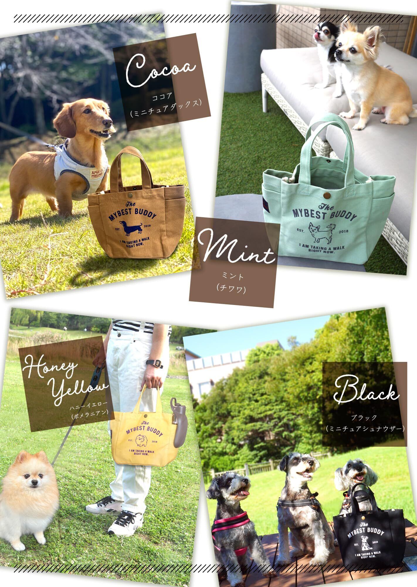 【Point 2】かわいいフロッキープリント付き 8種類のわんちゃんのプリントが可愛い 立体感のあるフロッキープリント(植毛プリント)だから価値観もあって素敵です。ベージュ(フレンチブルドック)、ネイビー(ミニチュアピンーシャー)、ピンク(トイプードル)、カーキ(柴犬)、ココア(ミニチュア・ダックスフンド)、ハニーイエロー(ポメラニアン)、ブラック(ミニチュアシュナウザー)、ミント(チワワ)の8種類の可愛いお散歩トートです。愛犬と同じバッグやプレゼントにも最適です。