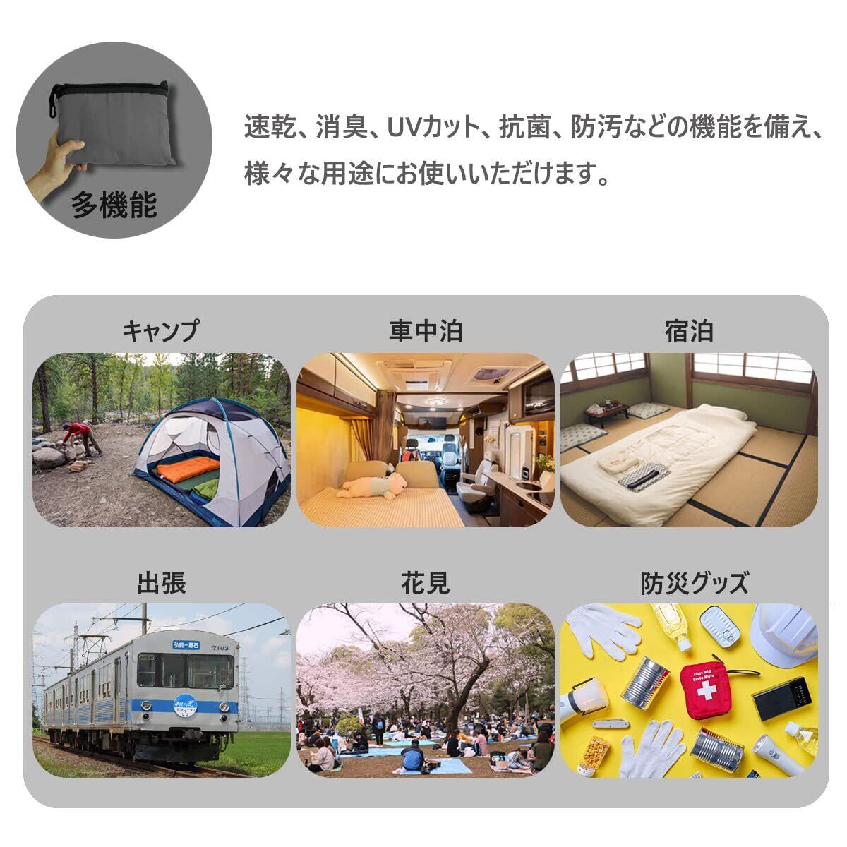 多機能性が高い:アウトドアやキャンプ、外泊、ホテル泊、車中泊、⼭⼩屋泊、お昼寝用、出張、旅行などに必須のグッズとして、速乾性、防臭性、UVカット、抗菌防汚加工などが施されているので、多機能性に使用可能です。また、もしもの災害時に防災グッズとしても使用可能です。