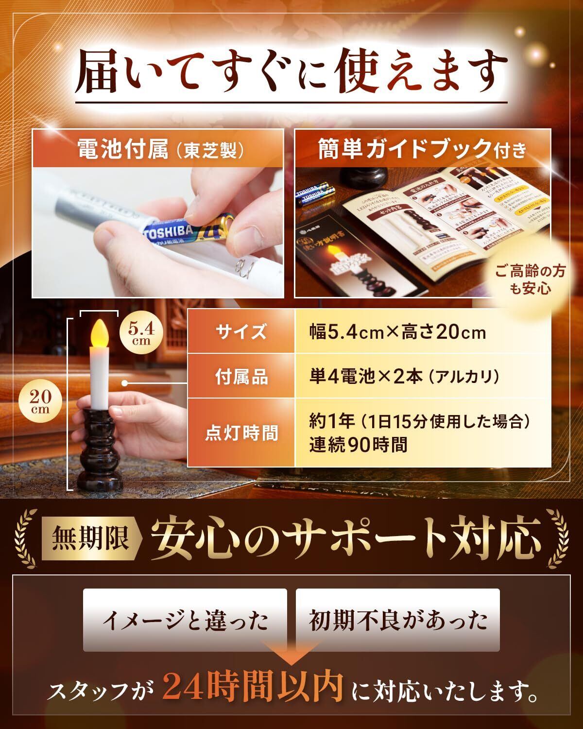 【本物のような ゆらぎ 】実際のロウソクを再現した自然な揺らぎが、お仏壇を優しく照らします。