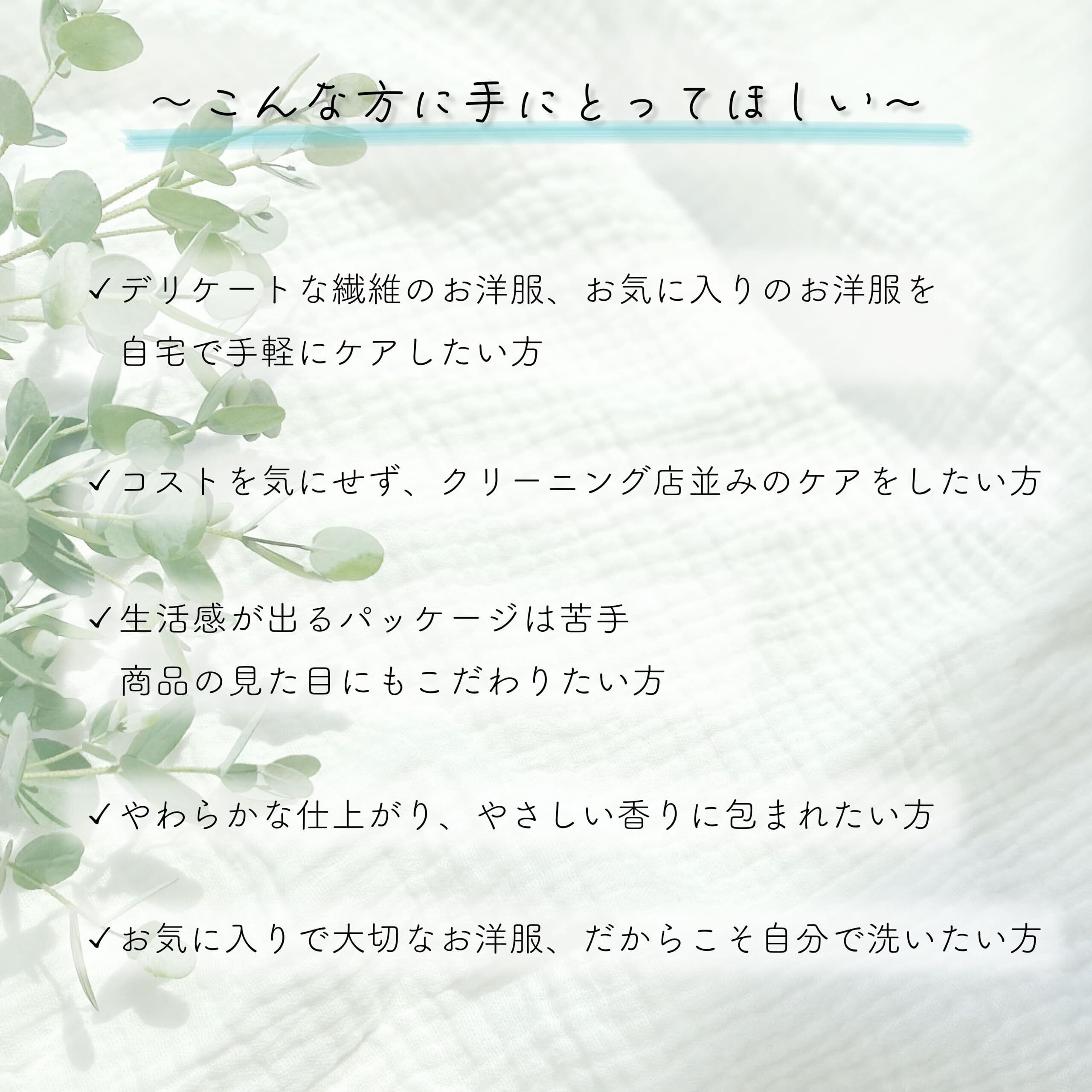 【こんな方に手に取ってほしい…】デリケートな繊維のお洋服、お気に入りのお洋服を自宅で手軽にケアしたい方 コストを気にせず、クリーニング店並みのケアをしたい方 生活感が出るパッケージは苦手、商品の見た目にもこだわりたい方 やわらかな仕上がり、やさしい香りに包まれたい方 お気に入りの大切なお洋服、だからこそ自分で洗いたい方
