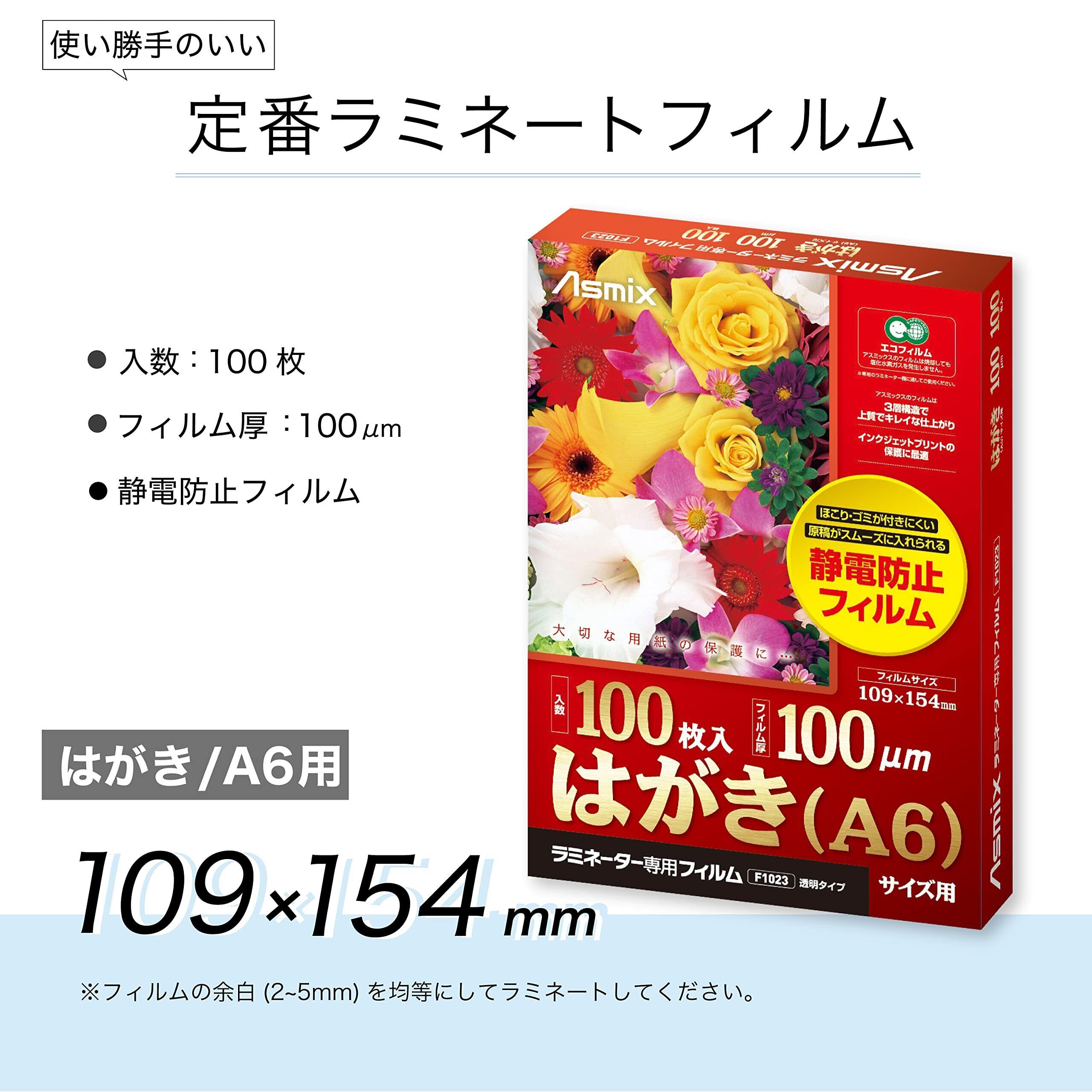 アスカ Asmix ラミネートフィルム はがきサイズ F1023 静電防止 100枚入り 100μ