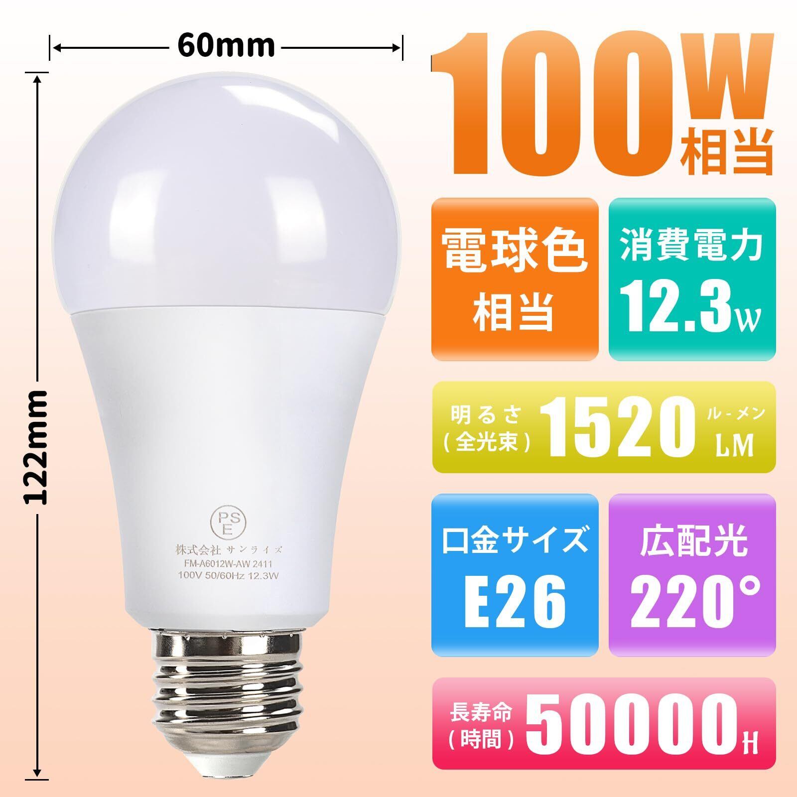 LED電球 E26口金 100W形相当 12.3W 1520lm 高輝度 電球色 2700K 広配光タイプ 高演色 省エネ 密閉形器具対応 調光不可 6個入 (100W形 電球色) | yankees