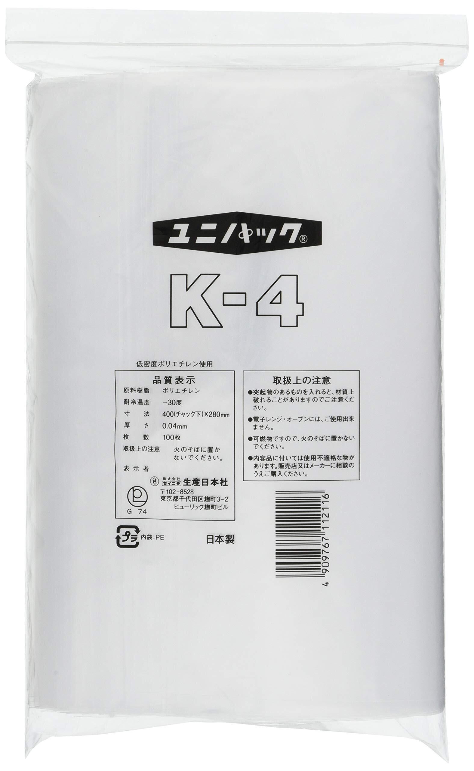 セイニチ 生産日本社 ユニパック(チャック付ポリ袋) K-4 ポリエチレン 日本 (100枚入) AYN0809