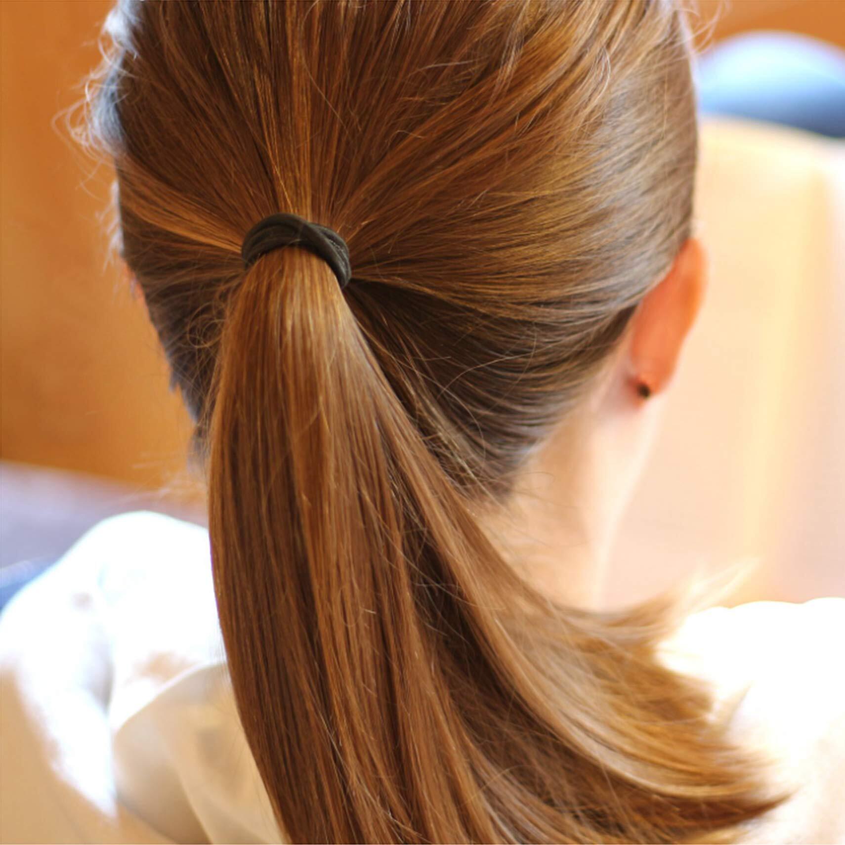 ブラックのヘアゴムは結び目なしのシンプル形状のため、学校や職場
