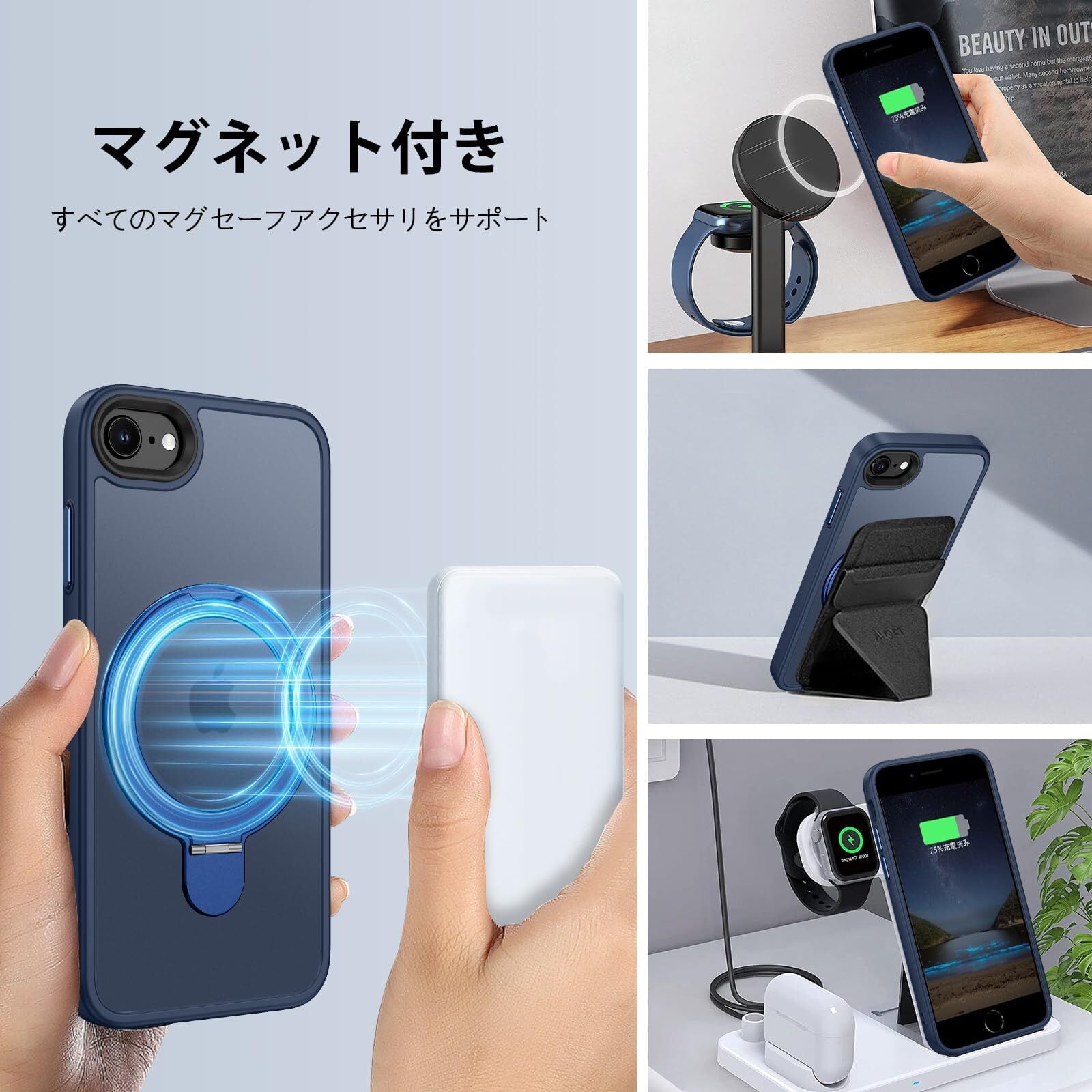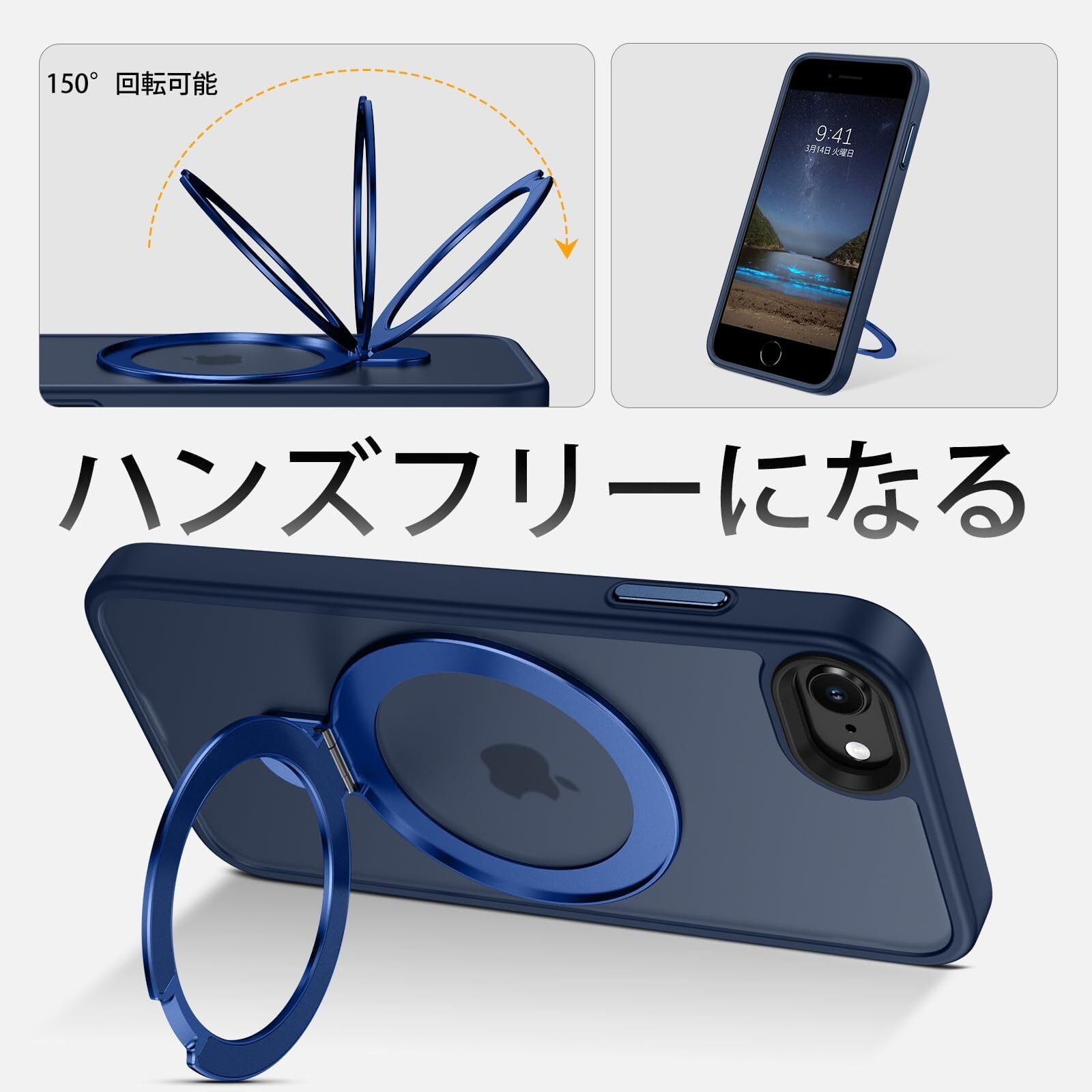 DUEDUE iPhone SE ケース 第2世代 第3世代 MagSafe対応 iPhone8/7 ケース マグネット搭載 リングスタンド機能 120°開閉可能 ブルー 半透明デザイン 指紋防止 耐衝撃 一体型 薄型 TPUケース 車載ホルダー対応 ワイヤレス充電 全面保護 | yankees