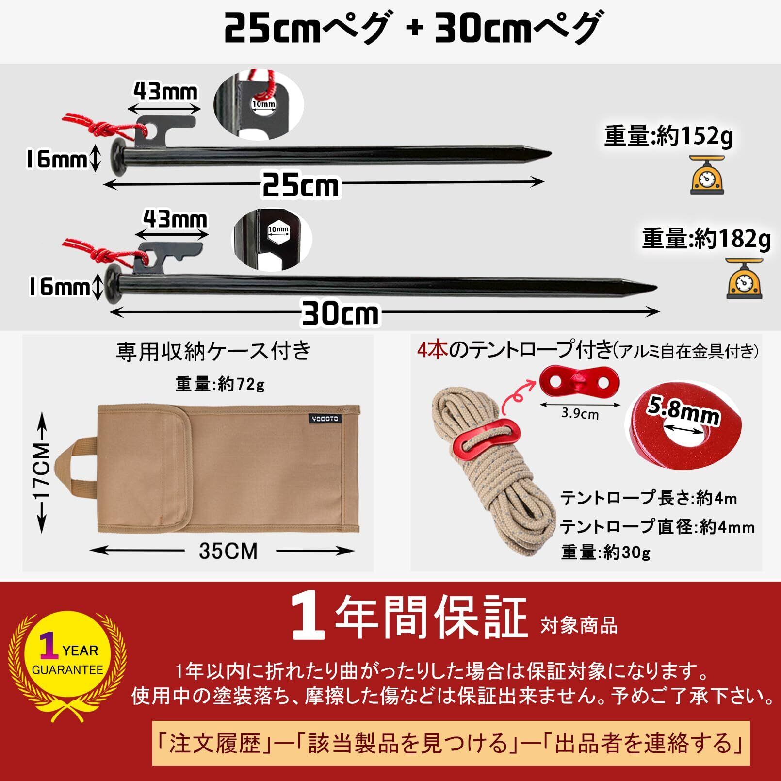 【YOGOTO】(25cm + 30cm) ペグセット ソリッド ステーク テント キャンプ ペグ 収納ケース 付き アルミ 自在金具 付き 一括収納 砂浜 草地 硬い 地面用 丸鋼ペグ 25cm8本 30cm8本 テントロープ4本 セット