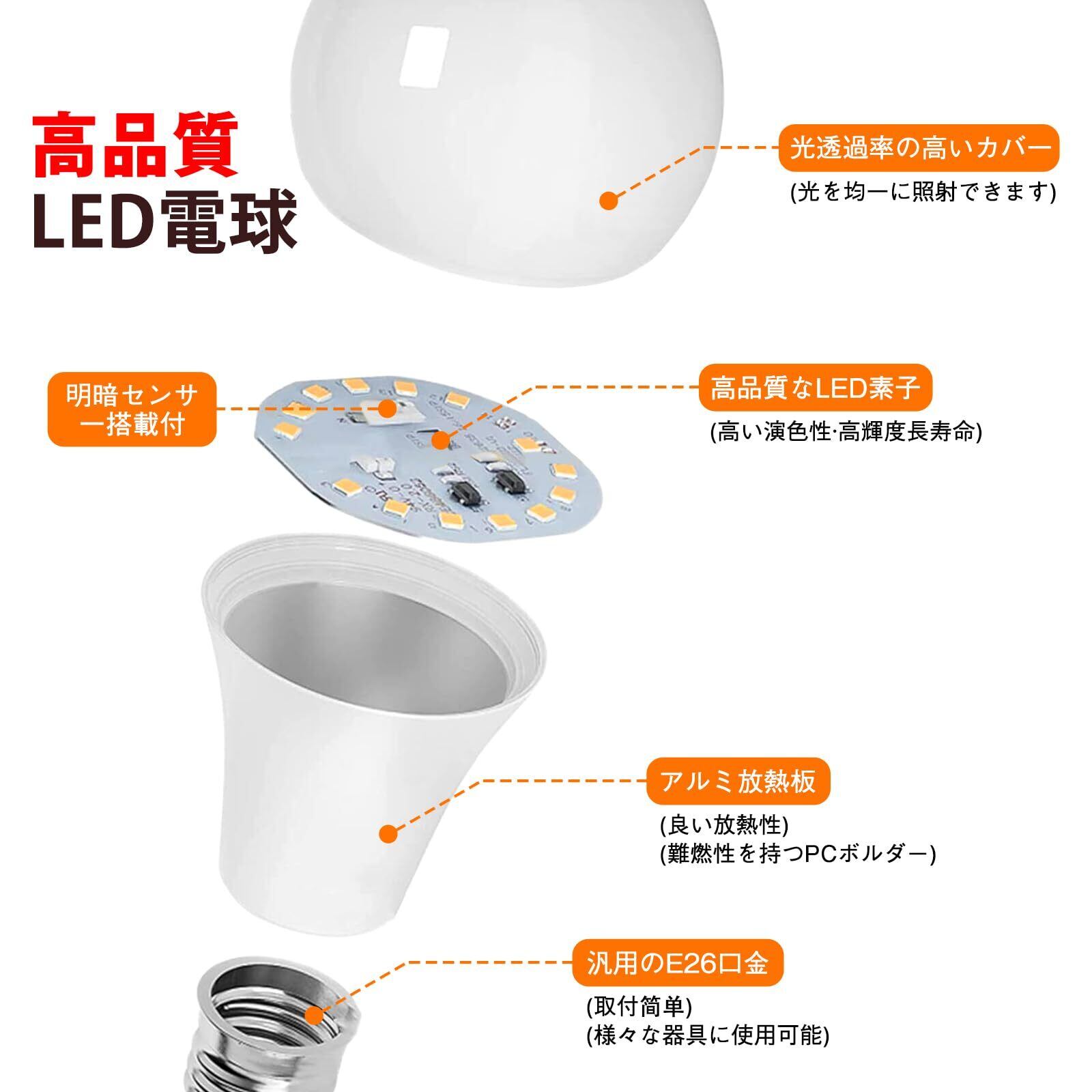 【明暗センサ機能付きLED電球】内蔵の光センサーモジュールにより、外部の光を検知。夕暮れから明け方まで(照度<15lux)自動点灯し、昼間(照度>45lux)に自動消灯。 ご注意:本品は人感センサー機能を搭載していません。正常の照明機能を維持するには、屋外での使用を推奨します。