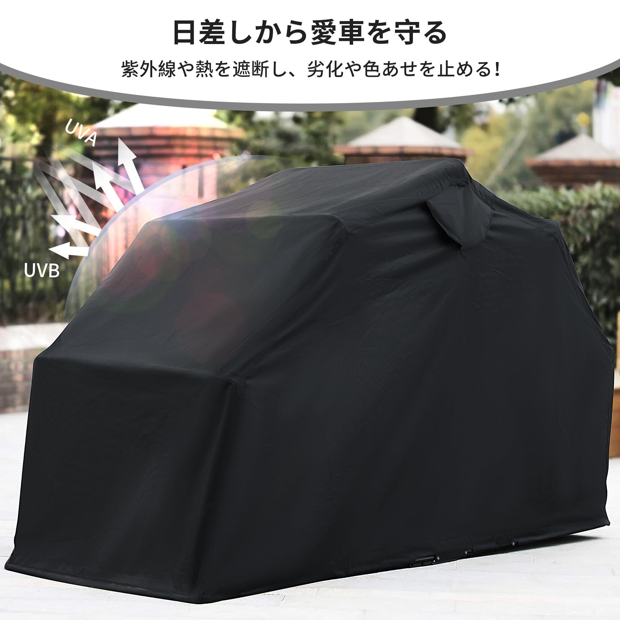 【日差しや風雨から愛車を守る】ガレージの布は600D高密度オックスフォード生地を採用!紫外線や熱を遮断し、大切な愛車の劣化や色あせを防ぎます。テント表面は撥水加工を施しており、防水性が信じられないほど高い!2000mm以上の耐水圧で雨水侵入を完全に防ぎます。