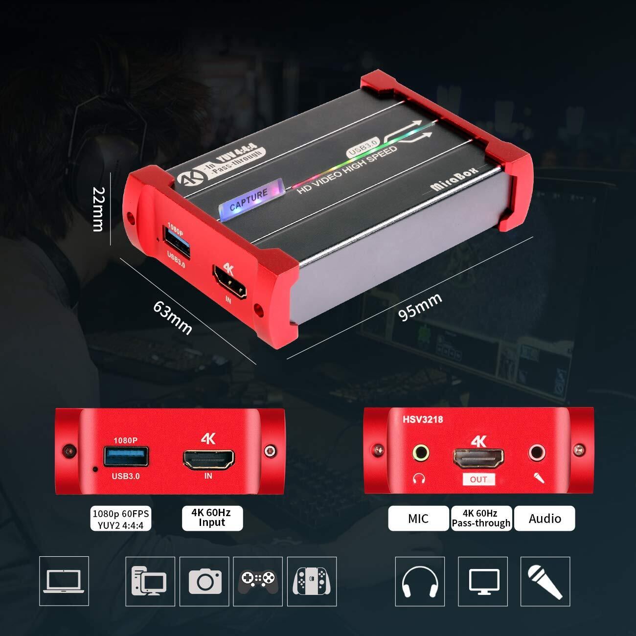 Mirabox 4Kキャプチャカード Nintendo Switch用 4K@60Hz入力とパススルー、1080P 60FPS USB3.0 ライブストリーミングと録音、Camlink デジタル一眼レフ、PS4、PS5 OBS Windows7/8/10 Mac OS Linux用