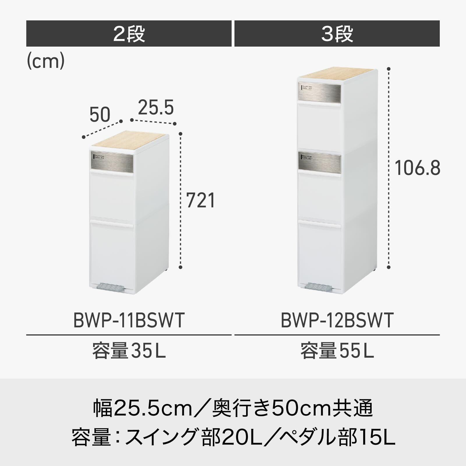 ライクイット (like-it) ゴミ箱 縦型 分別スイングステーション ペダル 3段 約55L (20Lx2段・15Lx1段) 耐熱木製天板 ナチュラル 約幅25.5x奥50x高106.7cm BWP-12BSWT 大容量 多分別 ダストボックス キッチン