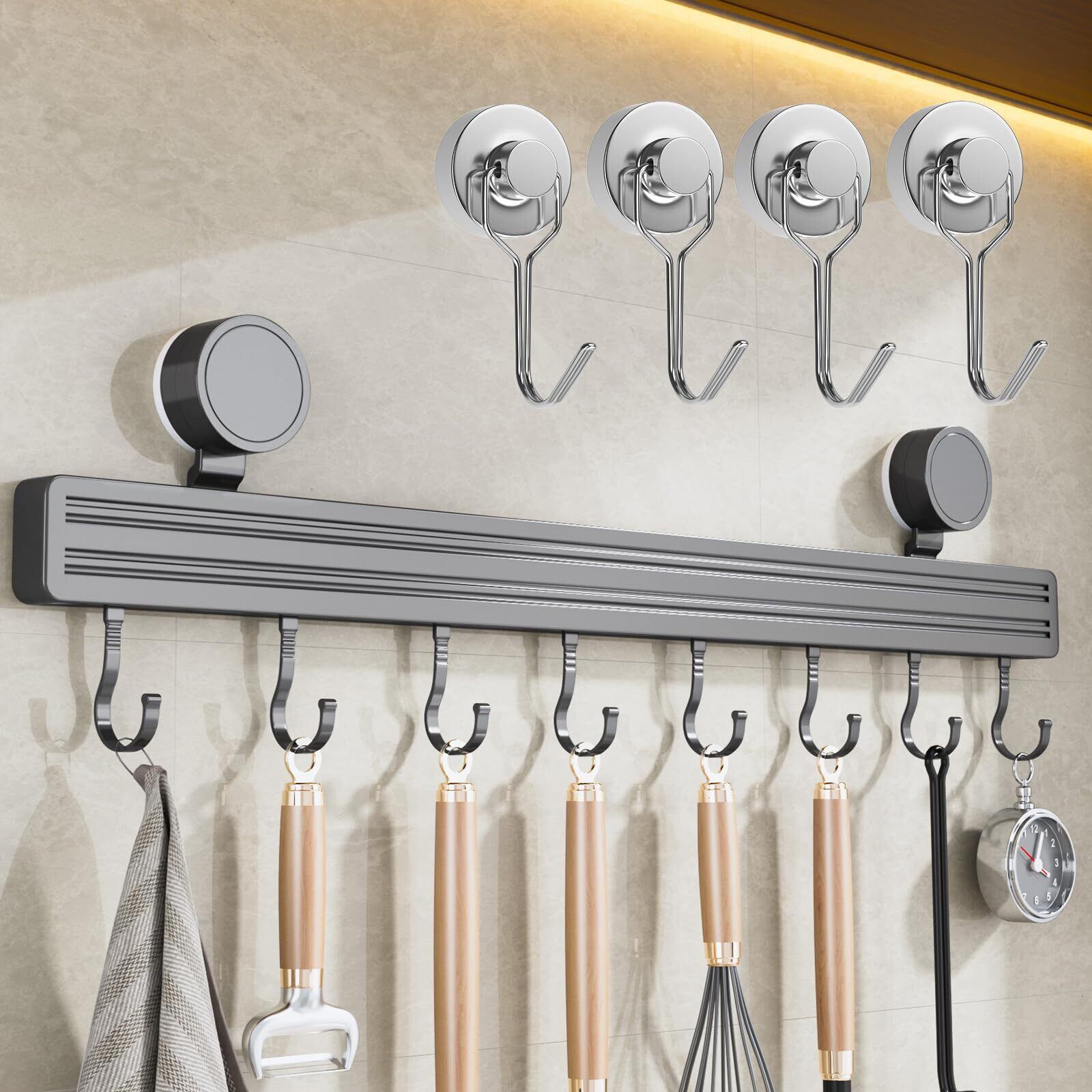SUOKOMR キッチンツールフック 壁掛けフック 粘着 強力吸盤 アルミニウム 防水防錆防油 軽量 穴あけ不要 台所 収納 調理器具 壁に穴を開けないフック バスルーム キッチン リビング ベランダなどに適用 40cm 8個フック マグネットフック(4個付き)