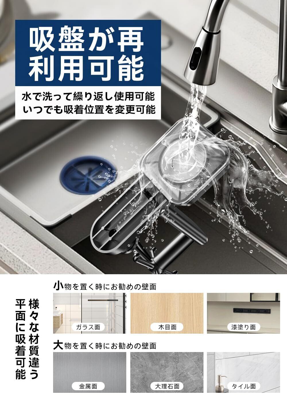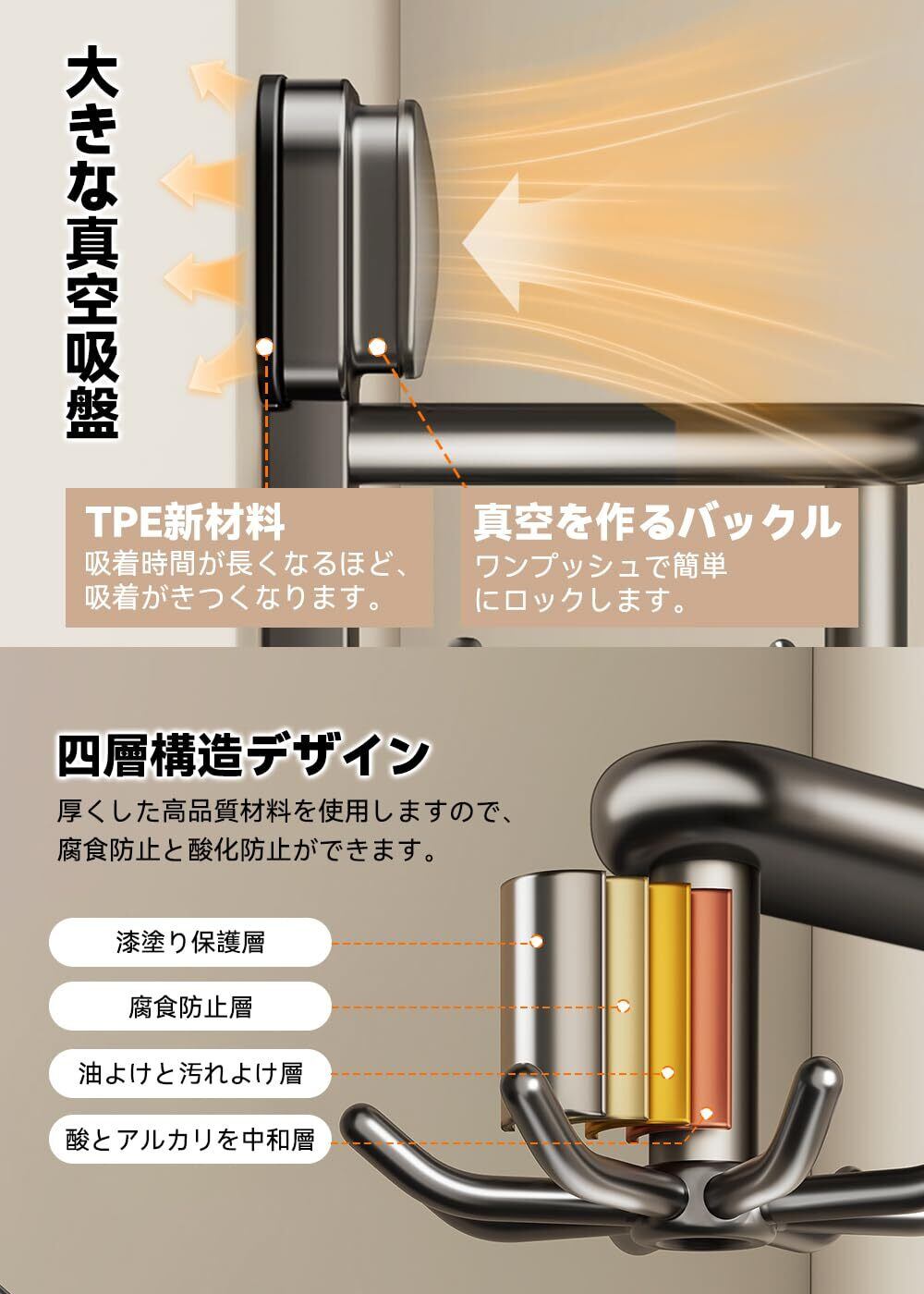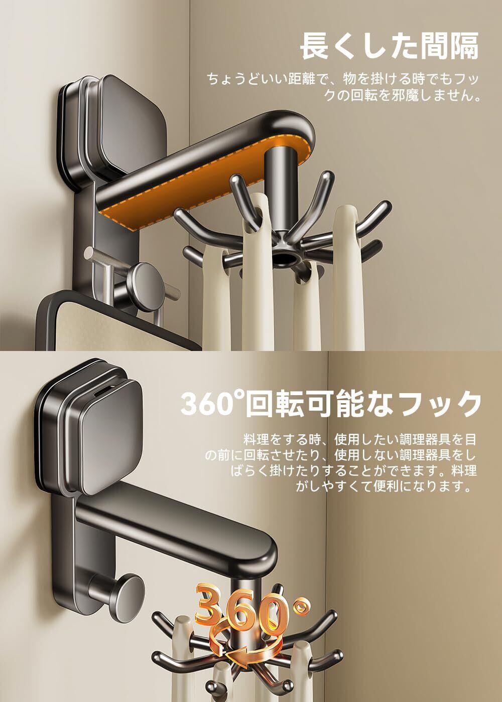 【革新の強力吸盤】弊社のキッチンツールフックは、全面的にアップグレードされた第4代の真空吸盤を使用しています。高品質の材料を採用、外殻はABSで、吸盤と壁の接続部分は最新のTPE材料で作られ、バックルをワンプッシュで簡単に真空を作ってロックします。そして、吸盤は粘着性があり、しっかりと壁に吸着でき、吸着時間が長くなるほど、吸着がきつくなります。取り外しの際には壁面に傷が残らないことも安心です。賃貸の方にお薦めします。