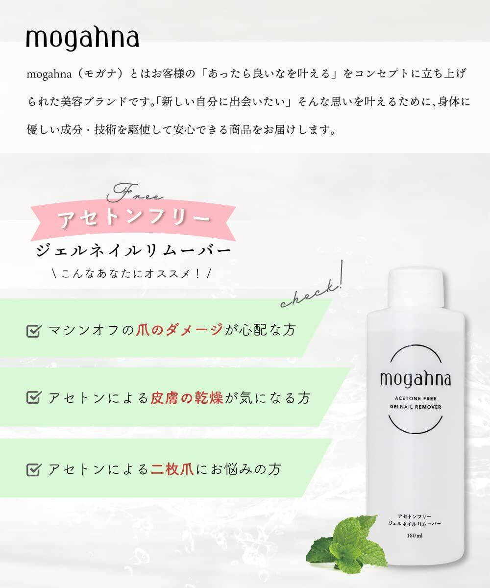 mogahna もがな ジェルネイルリムーバー アセトンフリー リムーバー ジェルオフ剤 ネイル ジェル除去 ジェルネイル 大容量 除光液 オフ ミント180ml 透明