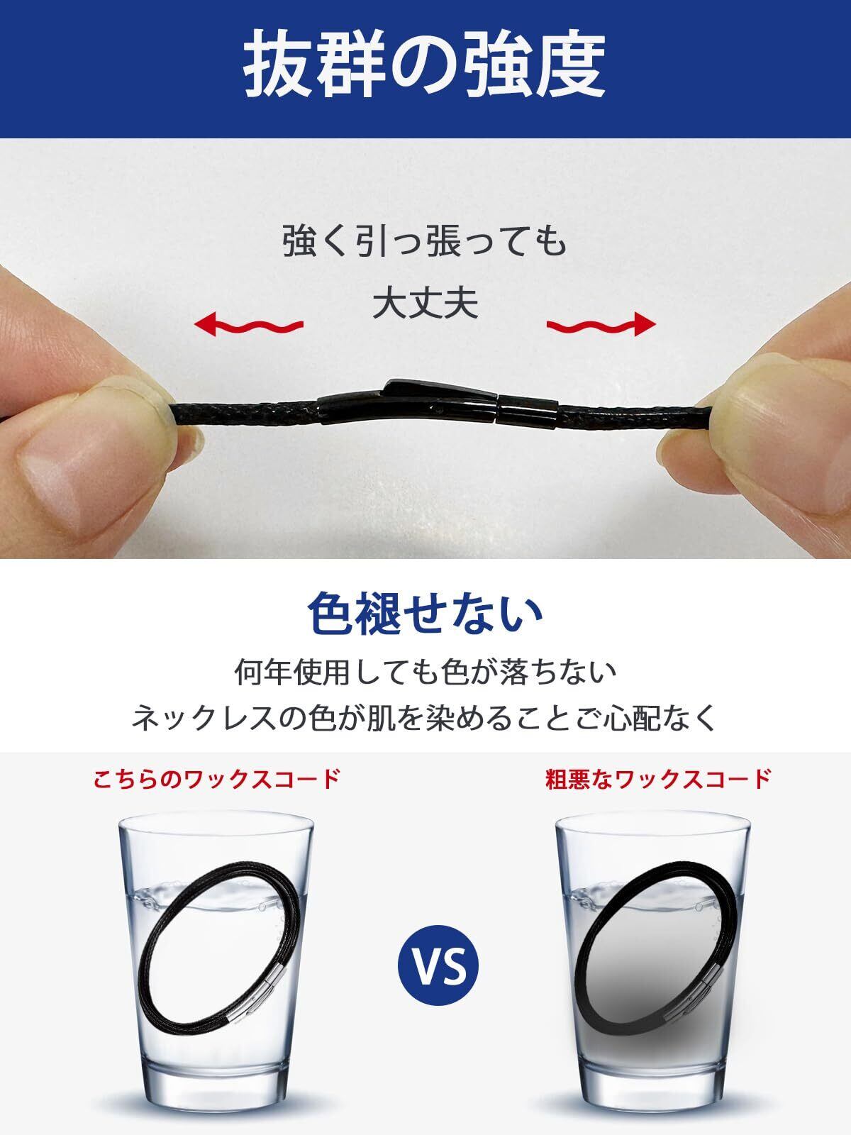 【水に強い紐ネックレス】チェーンネックレスと留め具が真っ黒のワックスコードネックレスが登場します。チェーンネックレス全体が黒で統一されているため、より調和がとれてクールな印象です。ワックスコードは革/レザーネックレスより汗や水に強く、耐久性に優れています。