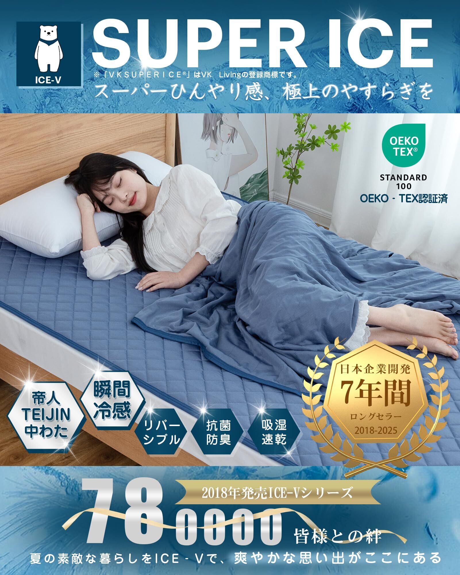 【進化を続ける「ICE-Vシリーズ」7周年記念!】人気のICE-Vシリーズ、今年で7周年!5年連続敷きパッド第1位、掛け布団第1位、タオルケット第1位、3冠達成!合計78萬枚突破!大変多くのご注文をいただき、本当にありがとうございます。OEKOTEX認証済、ISO9001認定工場、Transparencyによる確認済、最高の眠りを提供します!「ICE-Vシリーズ」は、これからも進化し続けます。