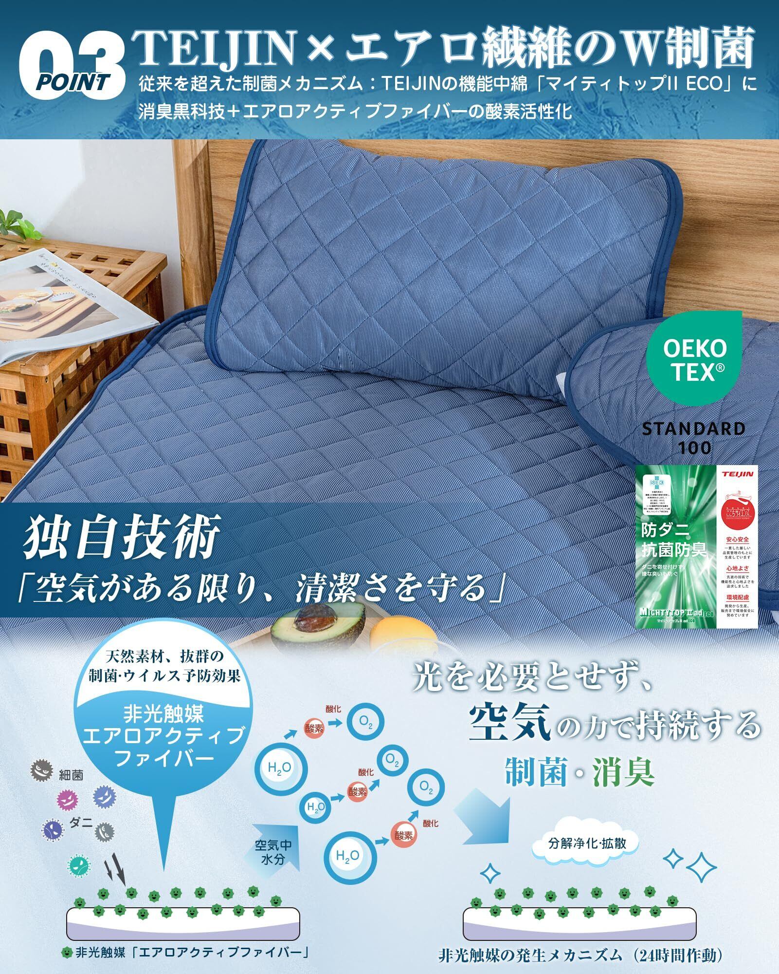 【TEIJIN×エアロ繊維のW制菌】 湿気や汗でジメジメする夏は、菌が繁殖しやすい季節です。中わたにテイジンの機能繊維「マイティトップII ECO」と、エアロアクティブファイバーの酸素活性化の組み合わせで、空気がある限り、24時間持続的に制菌消臭作用を発揮する。低ホルムアルデヒドなのでお子様にも安心。洗濯しても抗菌防臭・防ダニ効果は持続します。