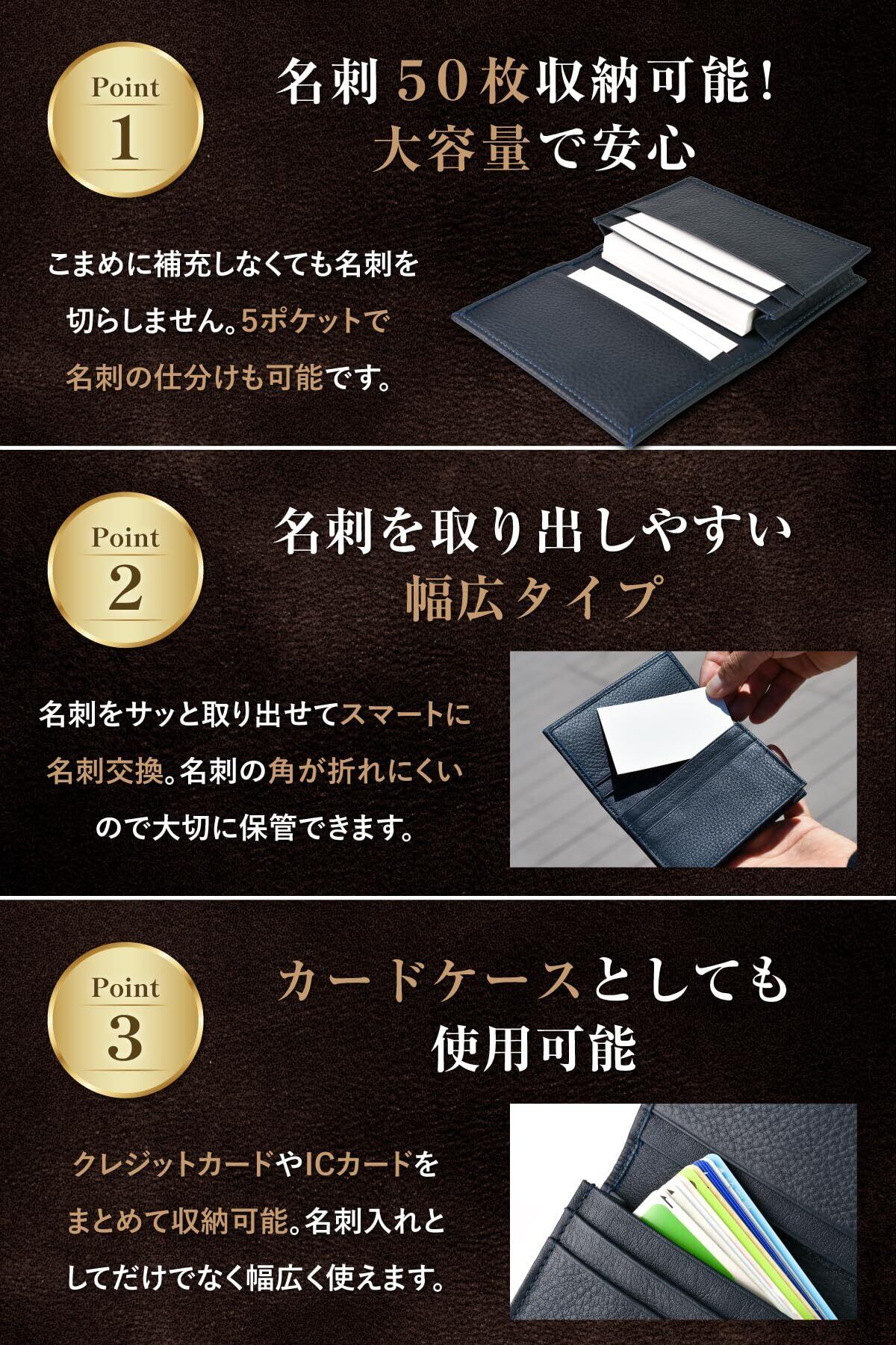【名刺をサッと取り出しやすい!幅広タイプ】少し余裕を持たせた作りになっているので、名刺を取り出す際につっかえてしまうことはありません。サッと取り出し、スマートな名刺交換が可能です。また、名刺の端や角が折れにくいので、名刺を大切に保管できます。