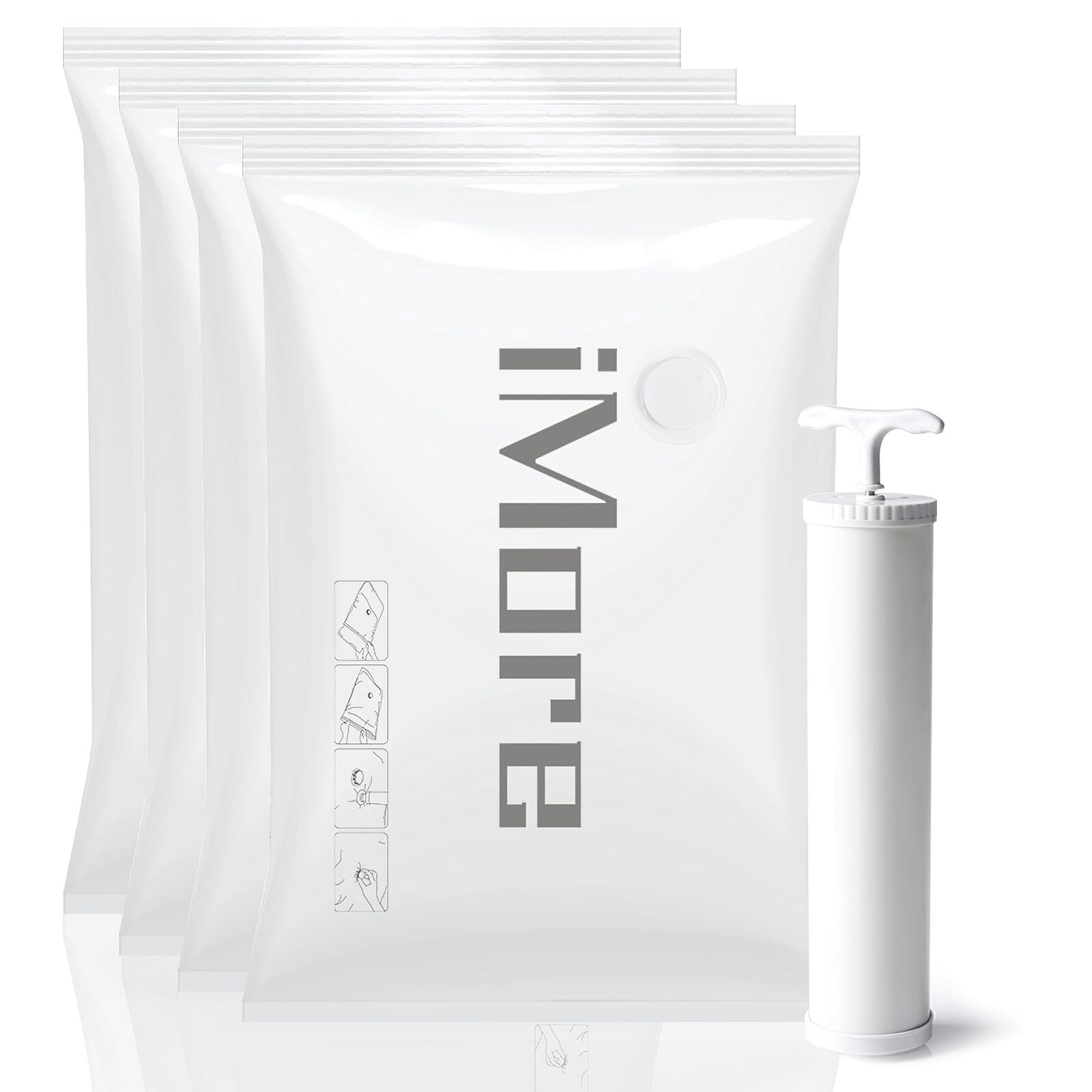 iMore 布団圧縮袋 特大サイズ 4枚入【100×80cm ポンプ付き】 衣類圧縮袋 な収納力 厚手 高密封・漏れなし 防塵防湿 カビ、ダニ対策 羽毛布団 毛布 ふとん 掃除機対応 収納/引越し/衣替え 真空圧縮バッグ