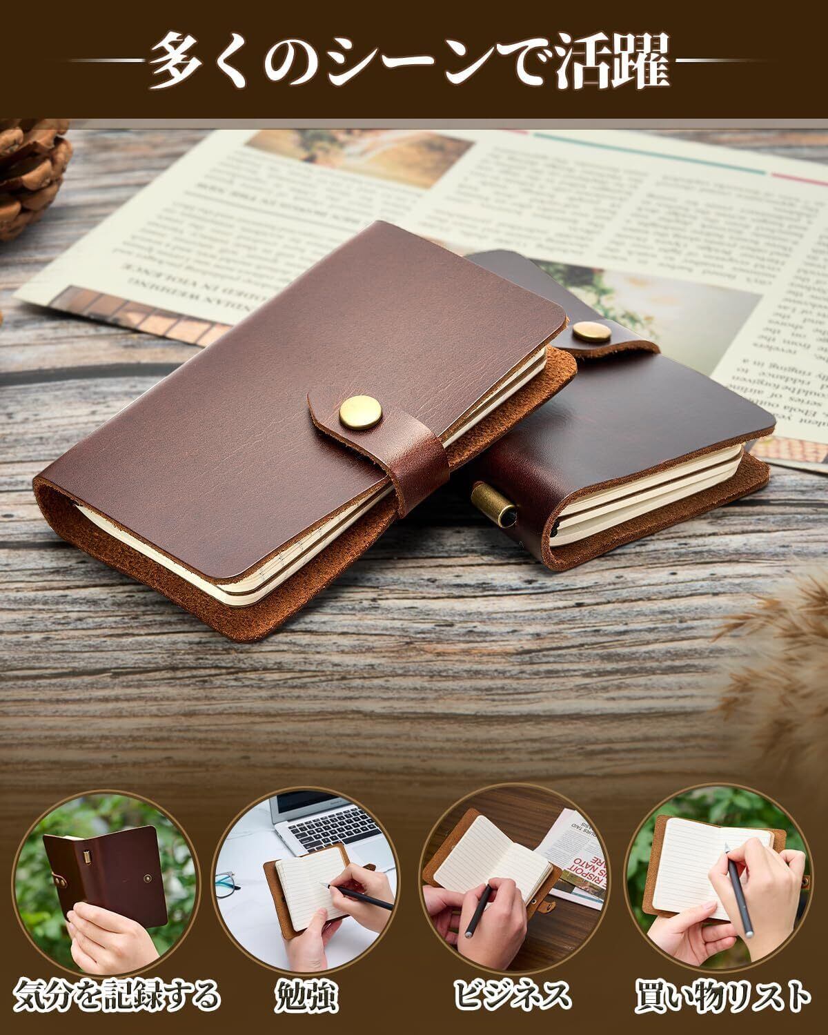 【上質な牛革製品の魅力】メモ帳は100%上質牛本革を使用し、厚くて柔軟な生地、素敵な質感あリ、皺になりにくく良い手触りがします。ナチュラルな革だからこそ見られる血筋痕やシワは使い込むほど馴染み、色艶が増して味となります。