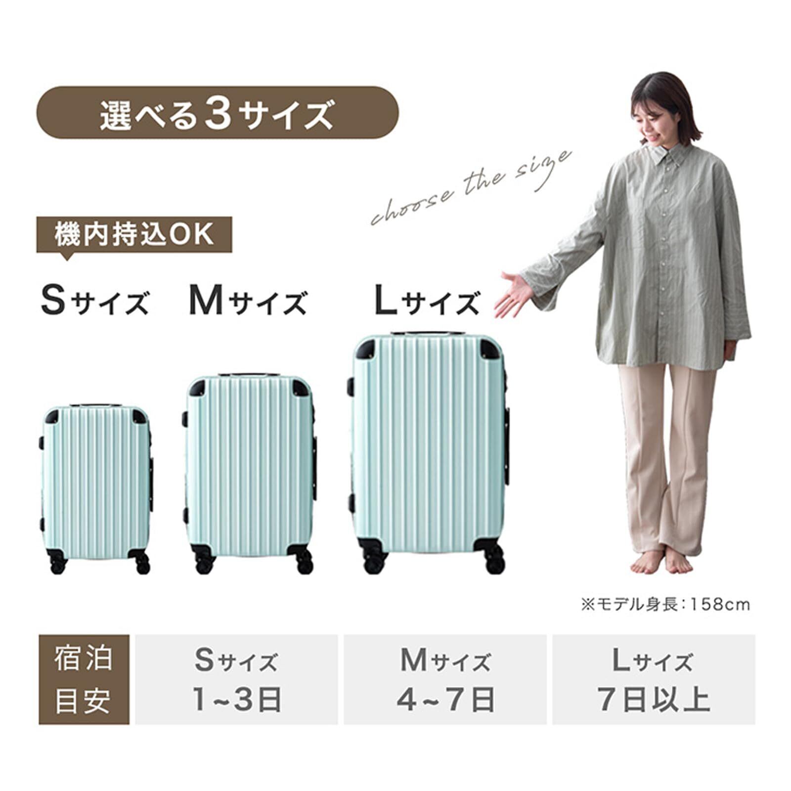 【備考】※TSAロックのキー(メイン・スペア)は本体メッシュポケットに収納されております。 ※ 内装中央部に付いているファスナーはメンテナンス用ですので開閉しないでください。 ※2023年10月24日よりカラーを一新し、シングルキャスターから消音・ダブルキャスターに変更しております。 ※機内持ち込み対応はSサイズのみとなります。 ※マチアップした場合、スーツケース内の荷物量によって機内持ち込みサイズを超える場合がございます。 ※寸法はキャスター・ハンドル・台座込みの外寸表記になります。測り方や荷物の詰め具合により多少の誤差が生じる場合がございます。あらかじめご了承ください。 ※Lサイズは航空会社により三辺の合計が規定を超える場合がございますのでご確認ください。