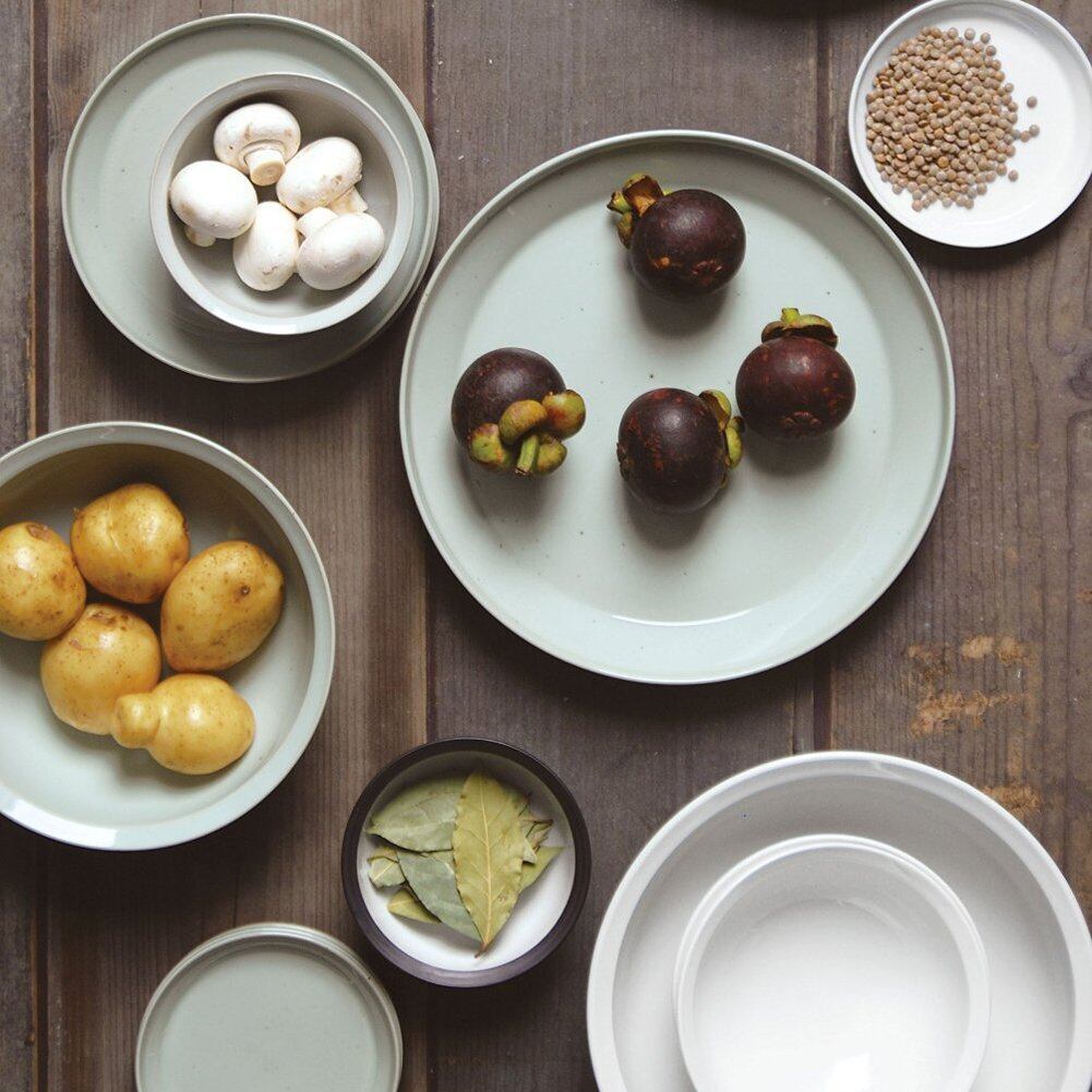 食卓に登場するどんなメニューにも対応できるオールマイティな形状とサイズ展開で、使い勝手がよく料理を引き立てる。