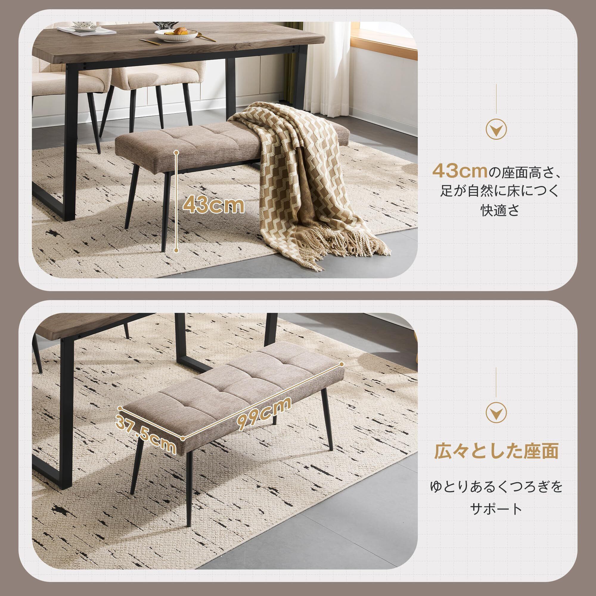 【商品サイズ】座面幅×奥行×高さ[90cm×37.5cm×43cm] 【材質】木、シリコンファイル棉、スチール、ノーダウン、ウレタン 【組立品/完成品】組み立て式 " 高密度スポンジ – ふんわりとした座り心地&通気性抜群 座面には高密度スポンジを使用し、しっかりとしたクッション性を実現。長時間座っても快適な座り心地をキープします。また、通気性の良い張地を採用しているため、蒸れにくく、季節を問わず快適に使用可能。適度な弾力があるため、足を置いた際のフィット感も抜群で、リラックスタイムをしっかりサポートします。" " 簡単組み立て – わずか数分で完成! 付属の工具で脚を取り付けるだけの簡単組み立て。女性一人でもスムーズに完成できます。高強度のスチールフレームを採用し、しっかりと固定されるため、ぐらつきにくく安定感抜群。耐久性にも優れ、長く安心してご使用いただけます。" " 多用途デザイン – あらゆる空間で活躍! ダイニングでおしゃれなベンチとして 書斎でちょっとした作業用スツールとして 玄関で靴の脱ぎ履きをサポート 寝室でリラックスタイムのパートナーに コンパクトながら実用性が高く、どこに置いても快適にお使いいただけます。"