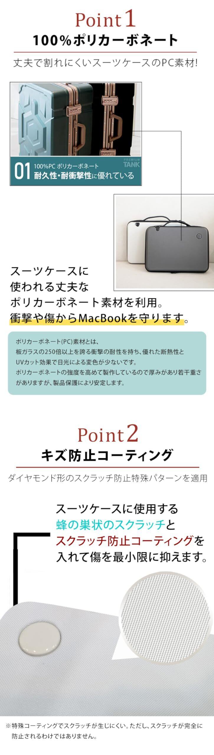 【最高級素材使用】ノートパソコンケース本体はドイツバイエル社の最高級PC(ポリカーボネート)を100%使用し、一般的に多く使用されるプラスチック(ABS)、ABS+PC材質より軽く、変色の恐れは少なく、強化ガラスの150倍の強度で耐衝撃は優れています。(製作段階で衝撃に弱くなる可能性があります。PCの材質は強度を高めて製作しており、より厚くて重さがありますが製品保護により安定的です。)