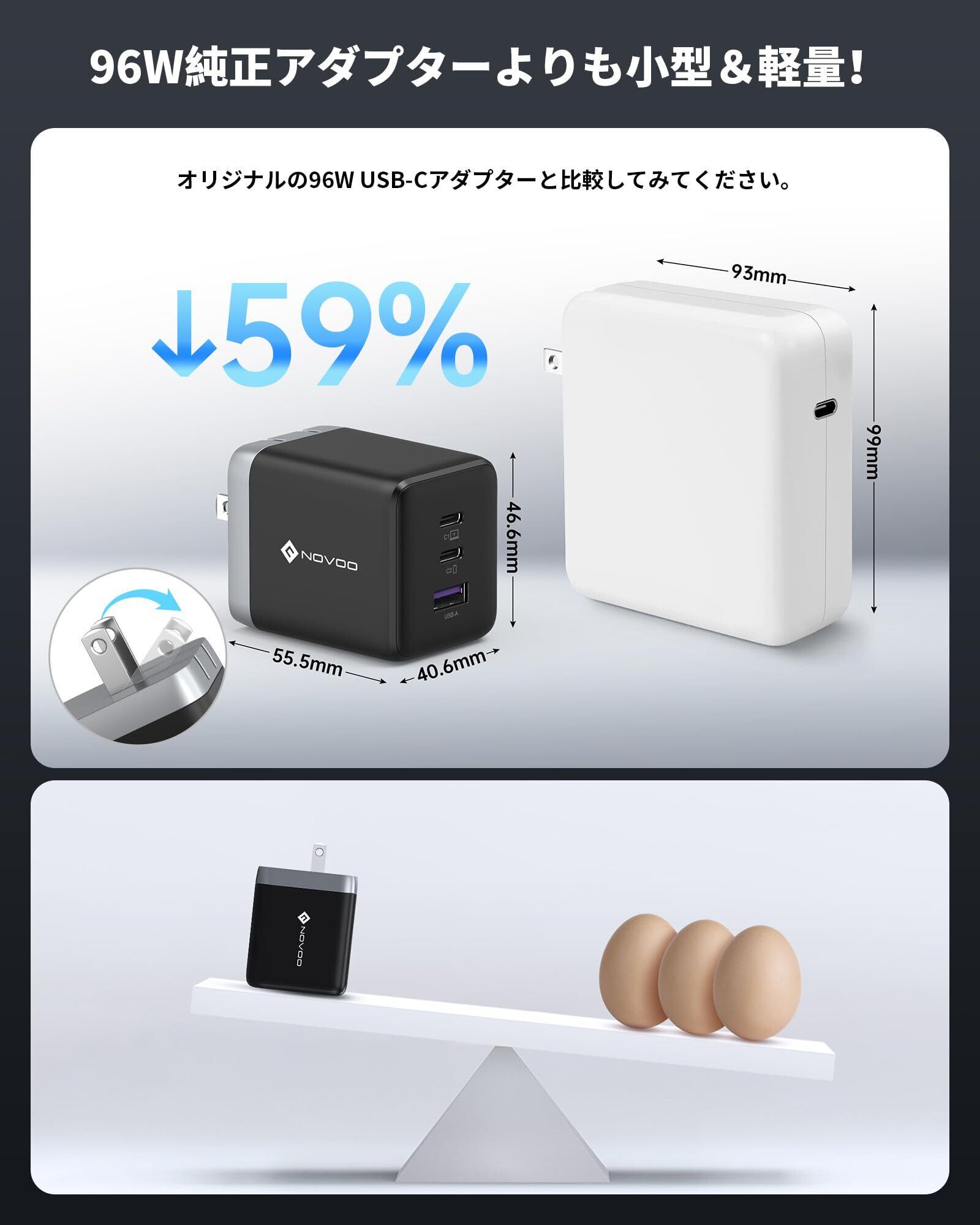 NOVOO 100W USB C充電器、MacBook充電器、3ポートGaN III高速充電ブロック(PD3.0、PPS対応)、折りたたみ式コンパクトUSB Cラップトップ充電器、iPad Pro、Galaxy S24/S23、iPhone 16/15/Pro、Dell XPS 13用USB Cプラグ