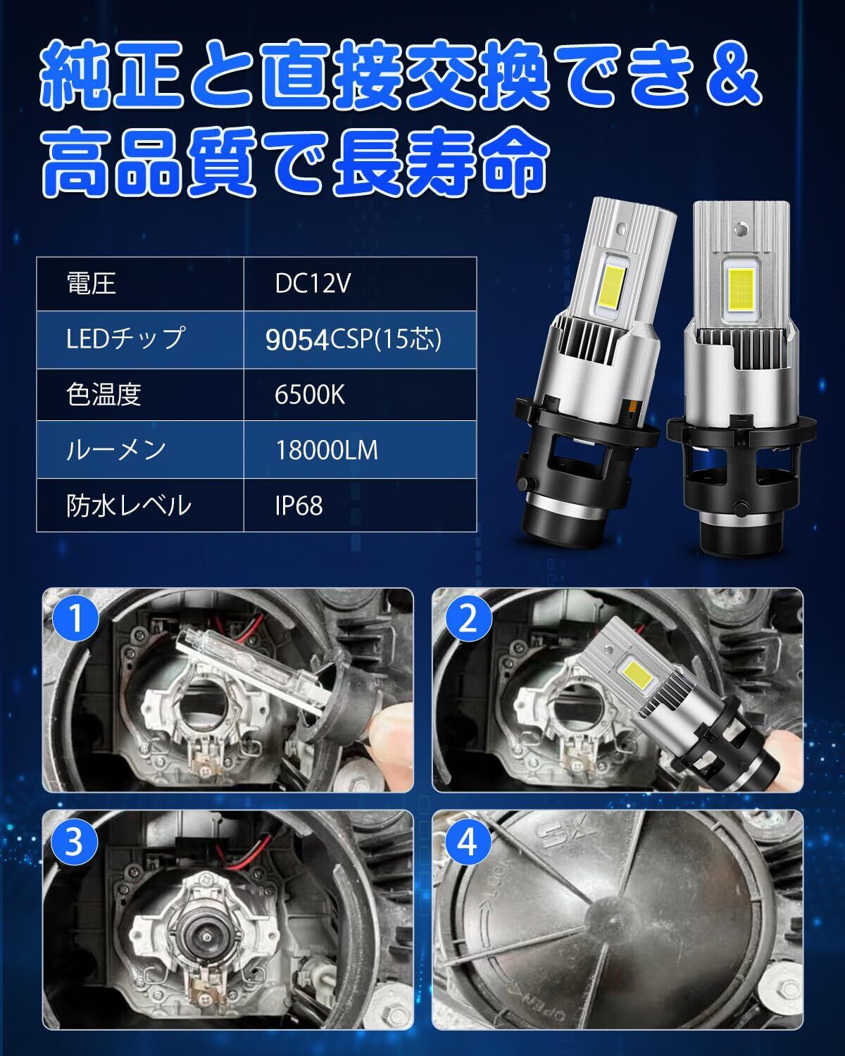 『製品情報』品名:D4S LED ヘッドライト/ノイズキャンセラー内蔵、定電流保護回路搭載/ケルビン数:6500K ホワイト/明るさ:18000lm以上/対応電圧:DC12-24V 35W*2/寿命:約50000時間以上/3年保証。 ※保証期間内故障が発生した場合、または何かご不明な点がございましたら、遠慮なく出品者にご連絡ください。ご注意:こちらのD4S LED ヘッドライトがD4S用のプロジェクターに使用しておすすめます。リフレクター用のD4Rとして使用すると、カットラインが出ない場合がございます、また、不適合による支障が生ずる場合もございます。もし、不注意でリフレクターに使用したら、遠慮なく出品者にご連絡ください。専用タイプを交換対応致します。本製品はDC12-24Vの日本軽自動車には対応していますが、24Vのトラックには対応不可です。