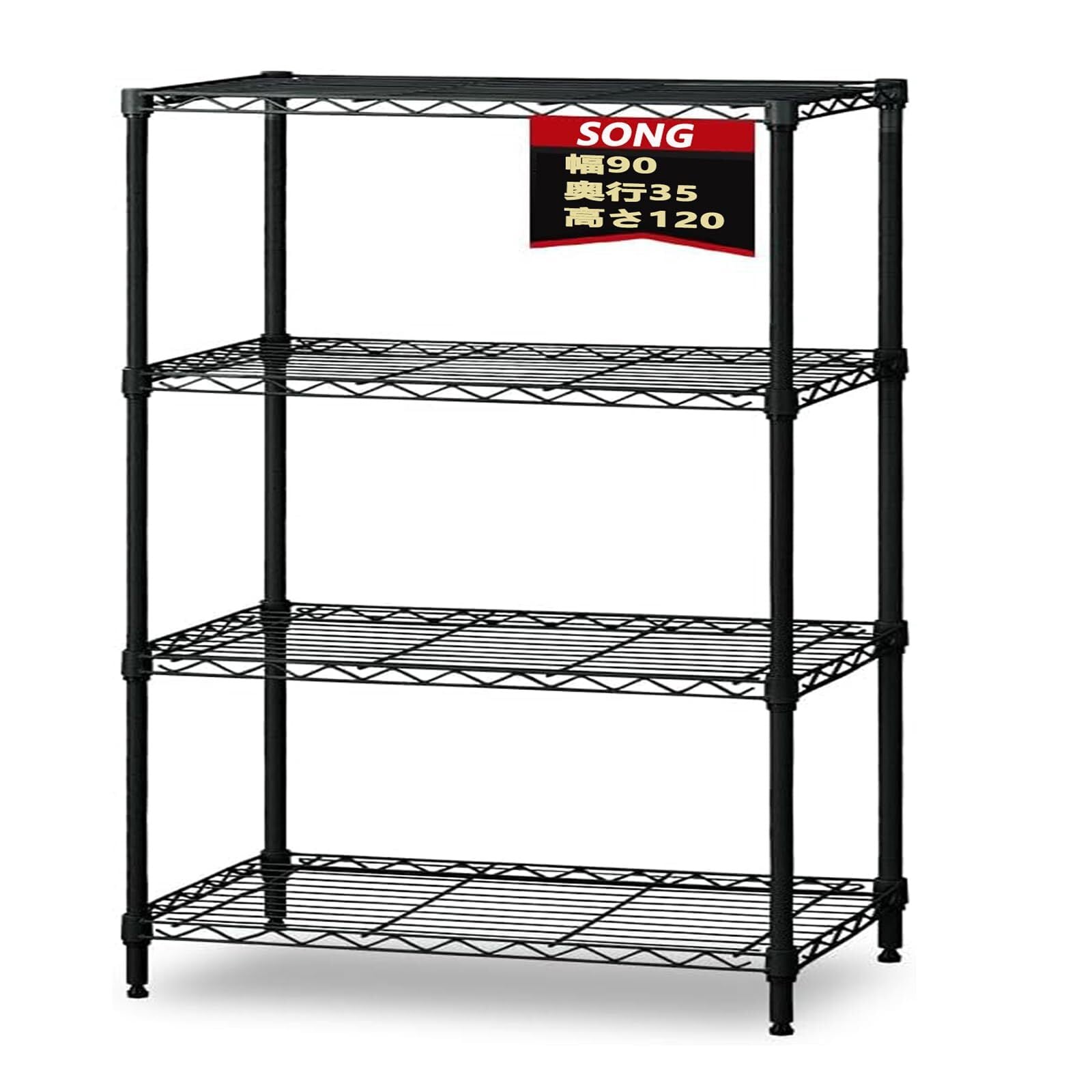 SONG 4段スチールラック 幅90×奥行35cm 高さ120/150/90cm選べる メタルラック シェルフ 収納棚 キッチンラック 収納ラック 高さ調整可能 キャスター付き 日本語説明書 (黒 4段-幅90×奥行35×高さ120cm)
