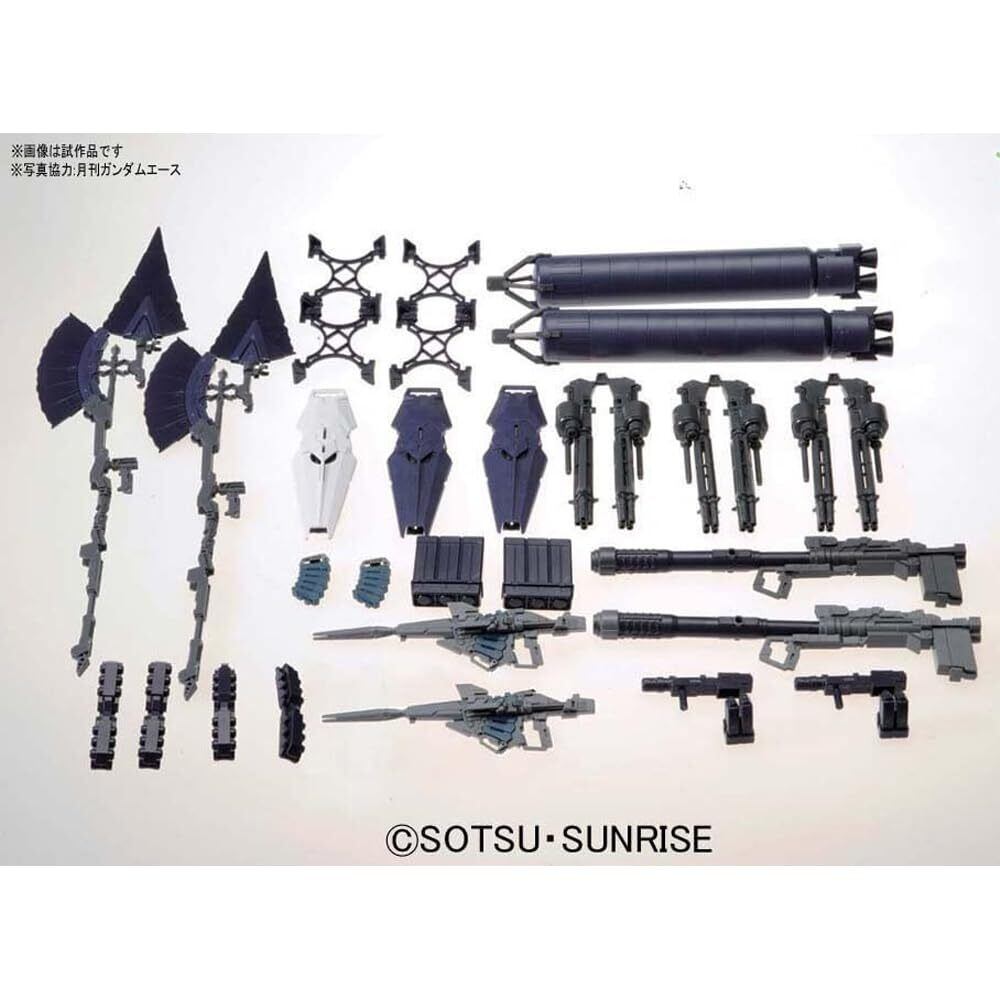 【付属品】ビームライフル×2、ビームサーベル×2、バズーカ×2、ハンドグレネード×2、グレネードランチャー×2、3連ミサイルランチャー×2、ヒートサーベル×4、シールド×3、ガトリングガン×6、ハイパー・ビーム・ジャベリン×2、アクションベース専用ジョイント、フィギュア×4、スラスターサポートスタンド一式、シークレットパーツ、ホイルシール、ドライデカール、テトロンシール、組立説明書