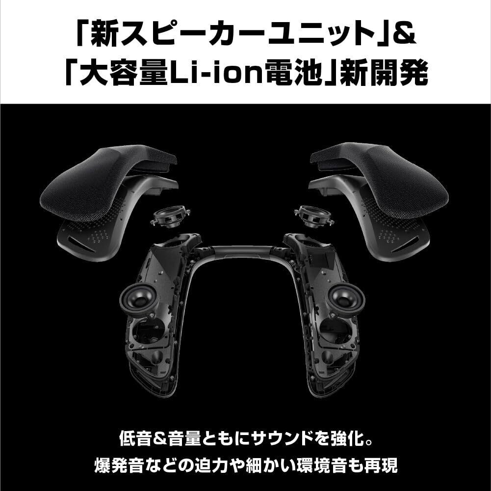 ●ゲームフィールドへのさらなる没入感を実現●専用無線使用による低遅延ワイヤレスで快適性向上●ノイズ&エコーキャンセリング機能を強化●低音・音圧の強化と定位感を改善させ、ゲームフィールドへのさらなる没入感※1を実現 4chスピーカー構成従来品(SC-GN01)のスピーカー構造を一新し、口径を34mmから38mmへと大型化することで、中低域を中心に音圧をアップさらに、独自の音声信号処理によって定位感を向上させたことにより、リアリティのあるゲーム体験が楽しめます●2.4 GHz帯の専用無線使用による低遅延ワイヤレスで快適性向上 データ通信用低遅延専用無線モジュール採用により、パソコンやゲーム機に送信機※2を接続することでワイヤレス化を実現ケーブルの制約から解放され、ゲームに没入※1できますさらに、本体の左右4点で重さを分散する構造により、首回りのストレスを感じにくく、長時間プレイしても疲れず集中してゲームが楽しめます