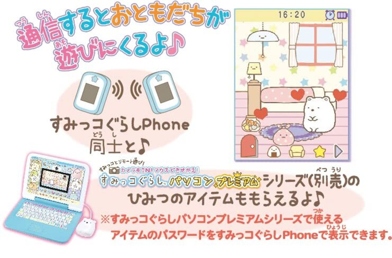 Point4 すみっコぐらしPhone同士で通信! すみっコぐらしパソコンプレミアムシリーズとも連動! 一緒に遊んでもっと楽しく!
