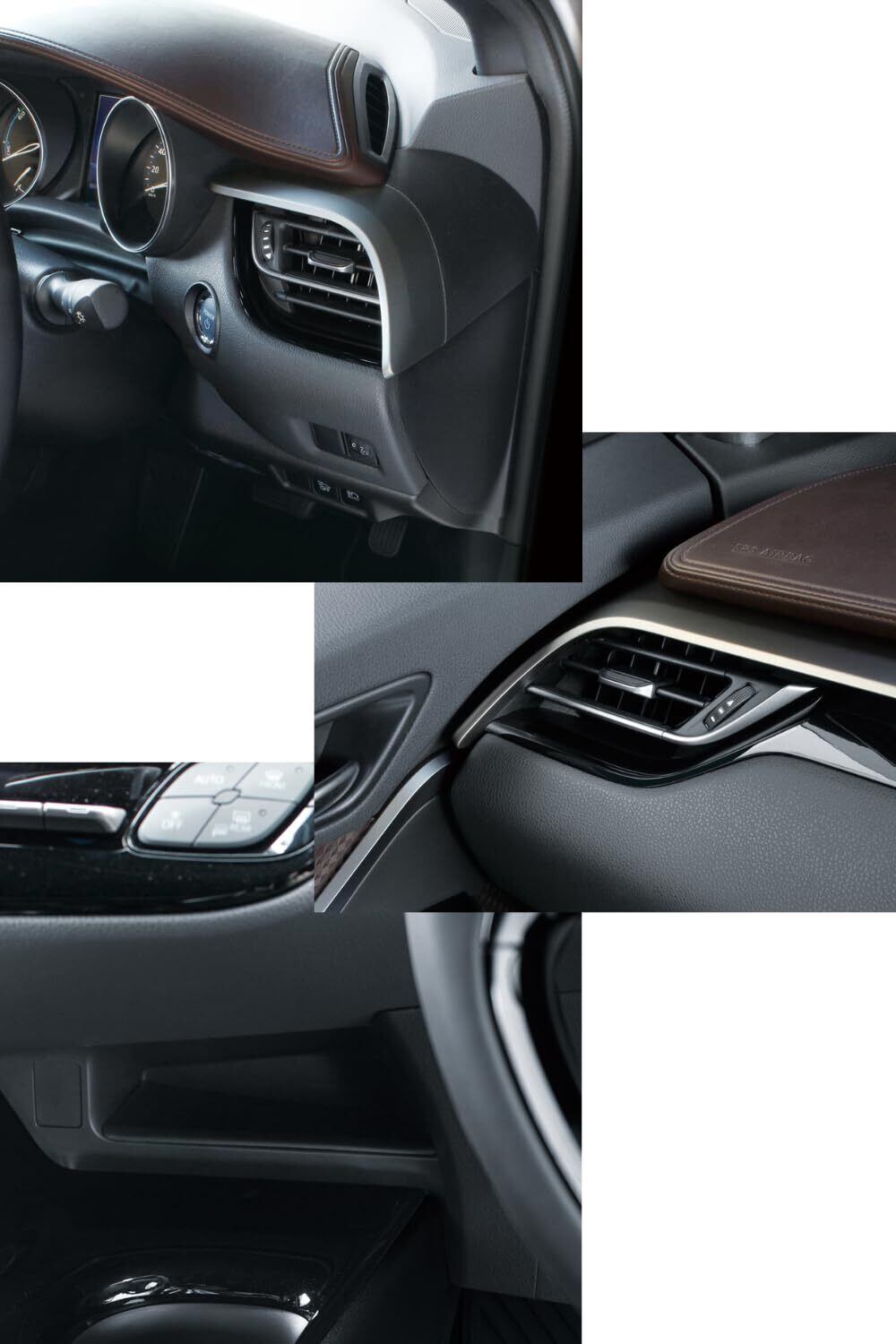 簡単装着の両面テープ付きで、エアコンフィンの可動を妨げません。内装に合わせたラメ入り黒ツヤ+革シボ調で、高級感を演出します。