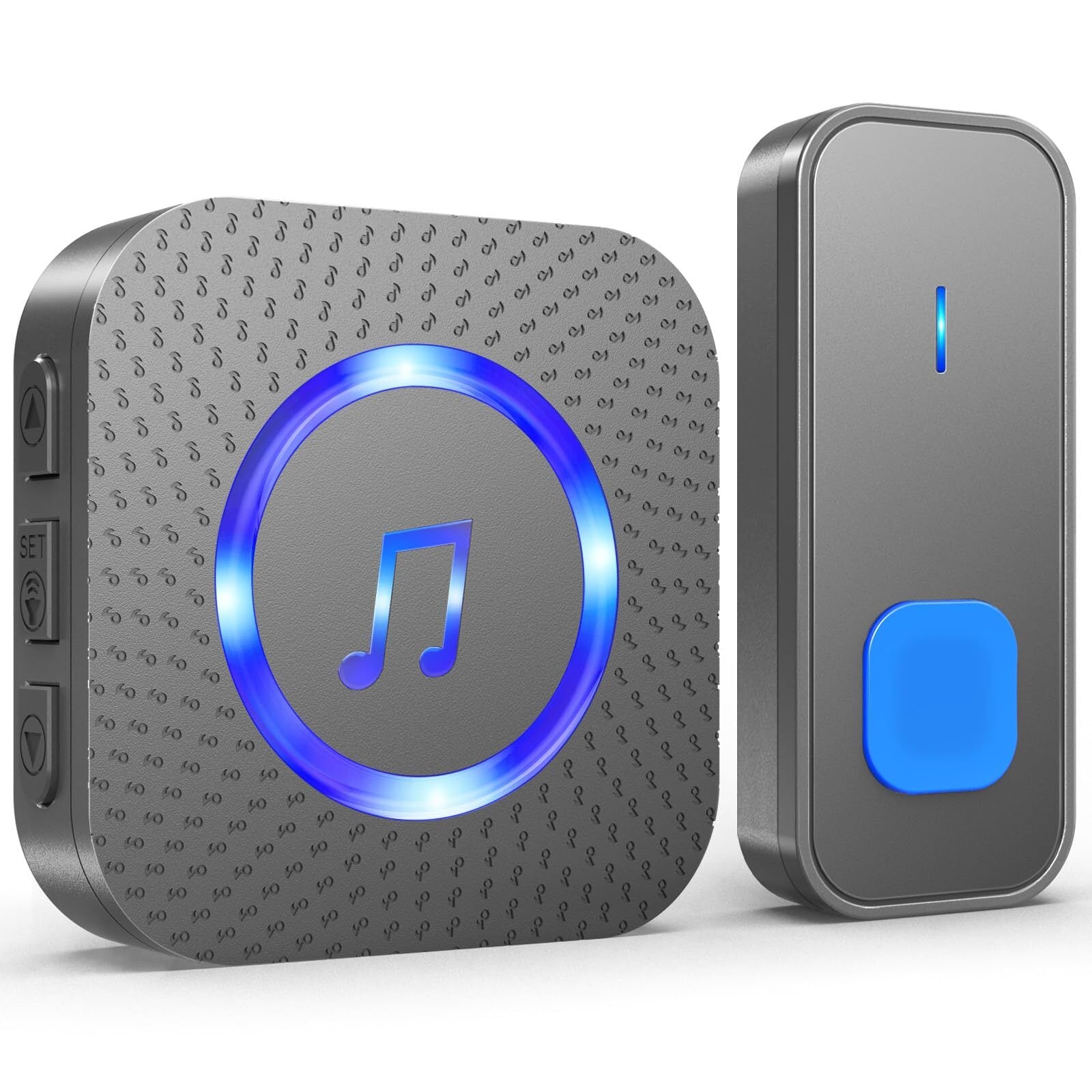 SURFOU ワイヤレスチャイム 玄関チャイム 工事不要 ドアベル 呼び鈴 電池不要 IP55防水防塵 400M無線長距離 55曲&5段階音量 室内 屋外 大音量 電池式送信機 プラグイン受信器 静音可能 LEDライト