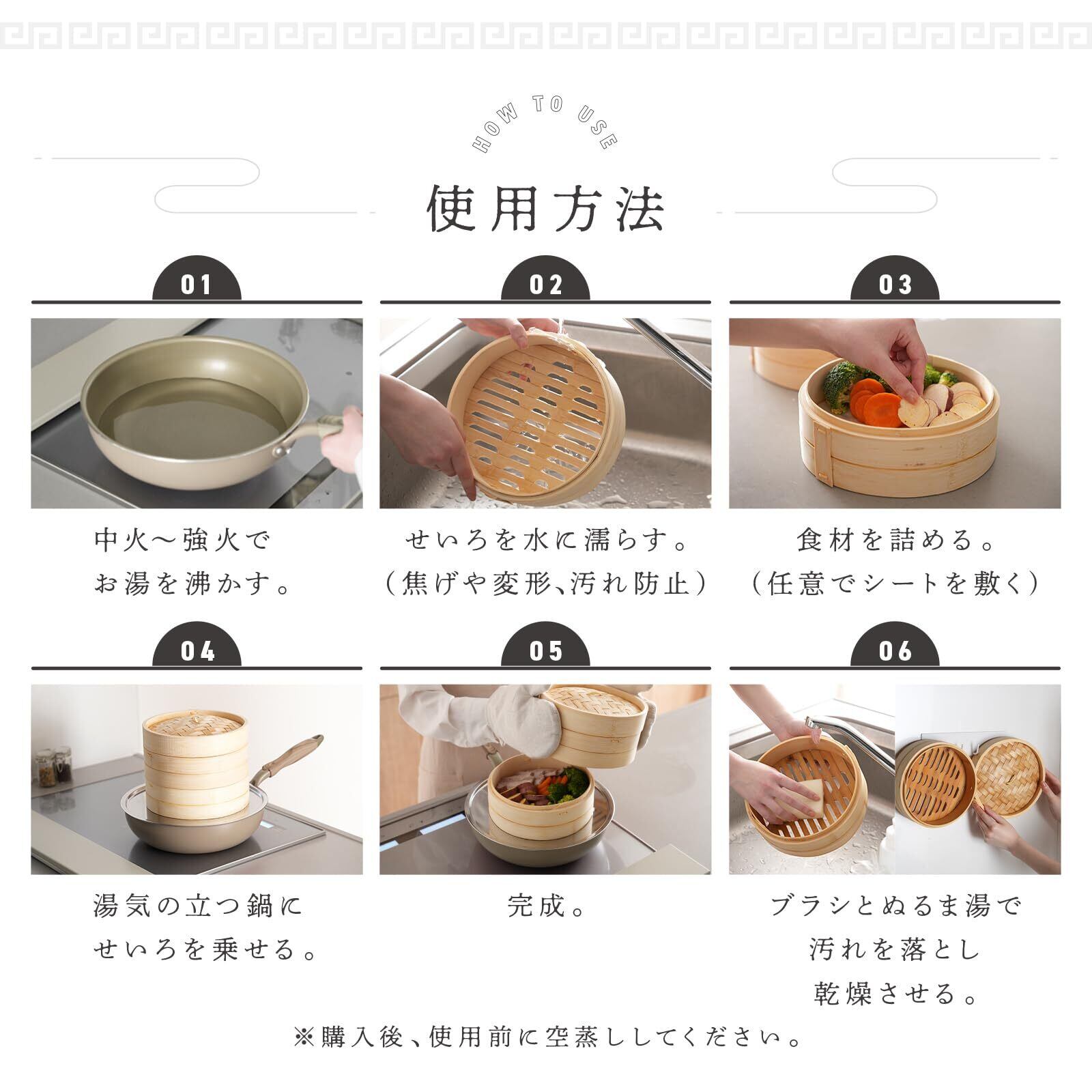 【ご購入後は水にくぐらせてください】ご使用いただく前に、必ず水にくぐらせ空蒸しをしてから調理するようお願いいたします。空蒸しで竹のアクや汚れを落としてからご使用ください。また、せいろは急激な乾燥や水に浸すことで劣化に繋がりますので、使用後は風通しの良い場所で陰干し、洗う場合は流水で洗うようご注意ください。