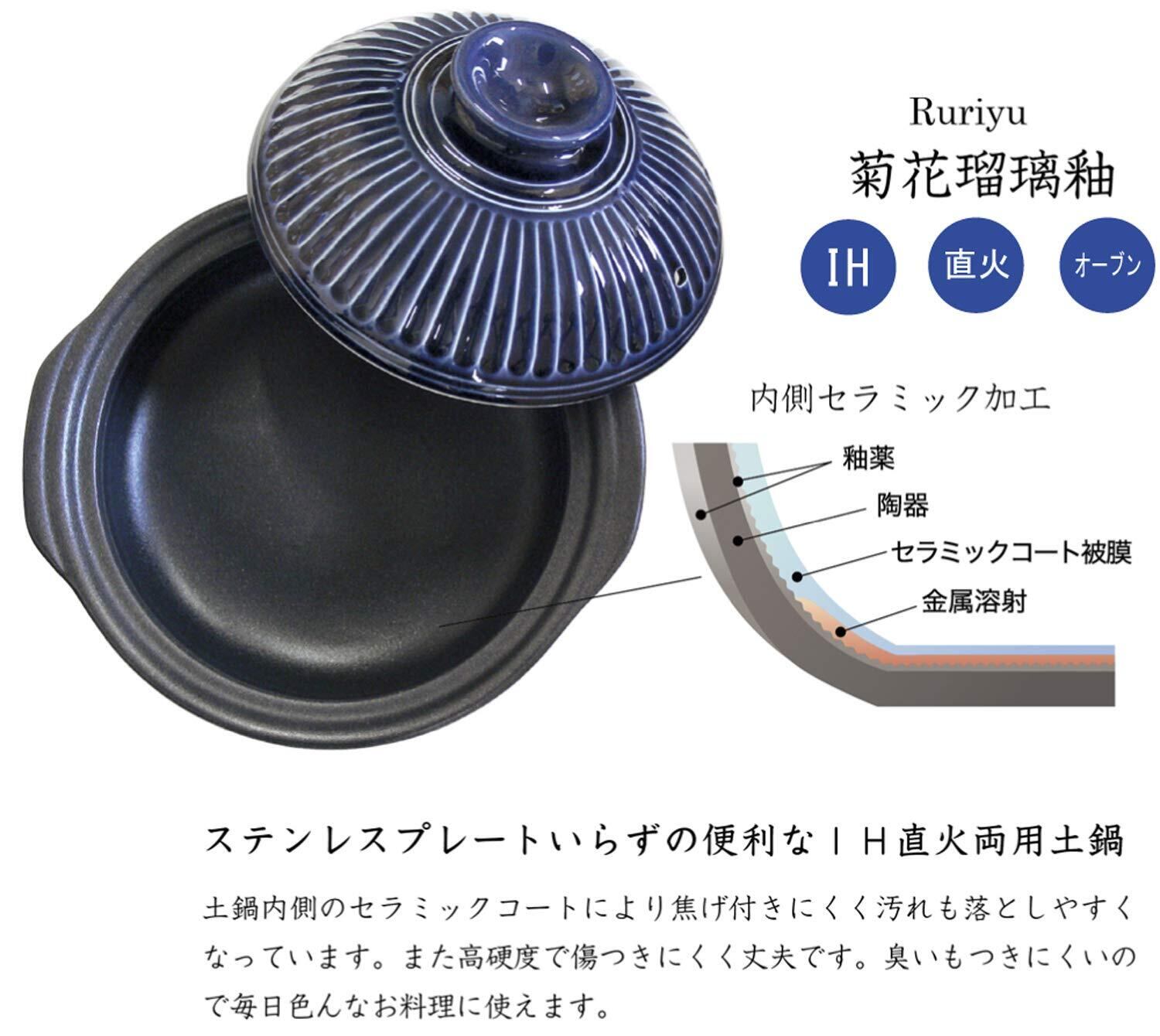 銀峯陶器 土鍋 IH対応 直火可 菊花 瑠璃 8号 2-3人用 萬古焼 日本製 2080-1854