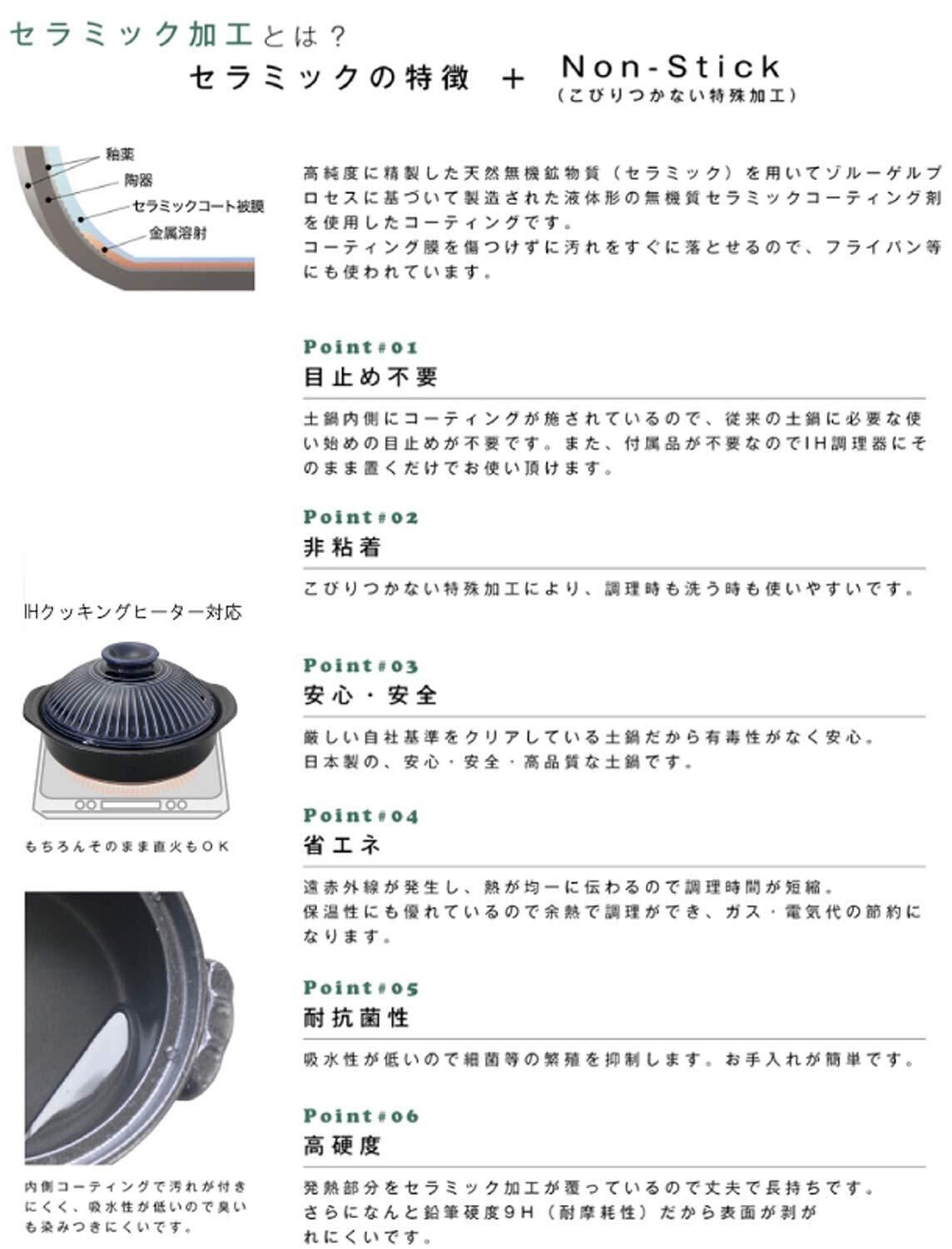 土鍋内側にセラミックコートを施し、焦げ付きにくく、汚れも落としやすく、臭いも染み込みにくい。