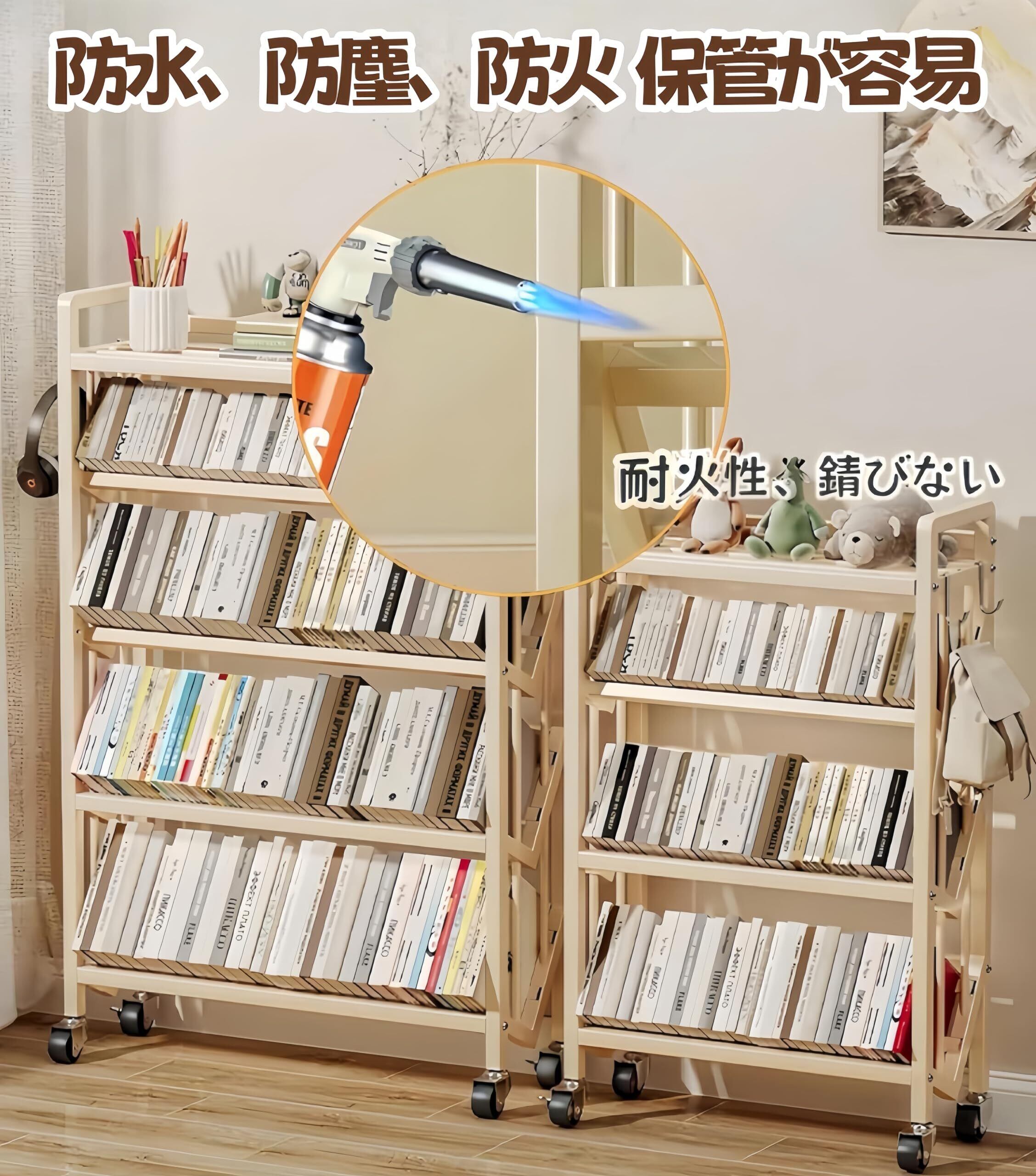 【耐荷重&フック付き】本棚はスチール素材を採用しており、各段の耐荷重が約25kg あるため、重たい物もしっかり収納できます。耐荷重が良く、変形しにくく、頑丈で耐久性があります。取り外し可能のフック付き、サイドにヘッドホンやバッグなどを掛けることができます。シンプルなデザインで置く場所を選びません。