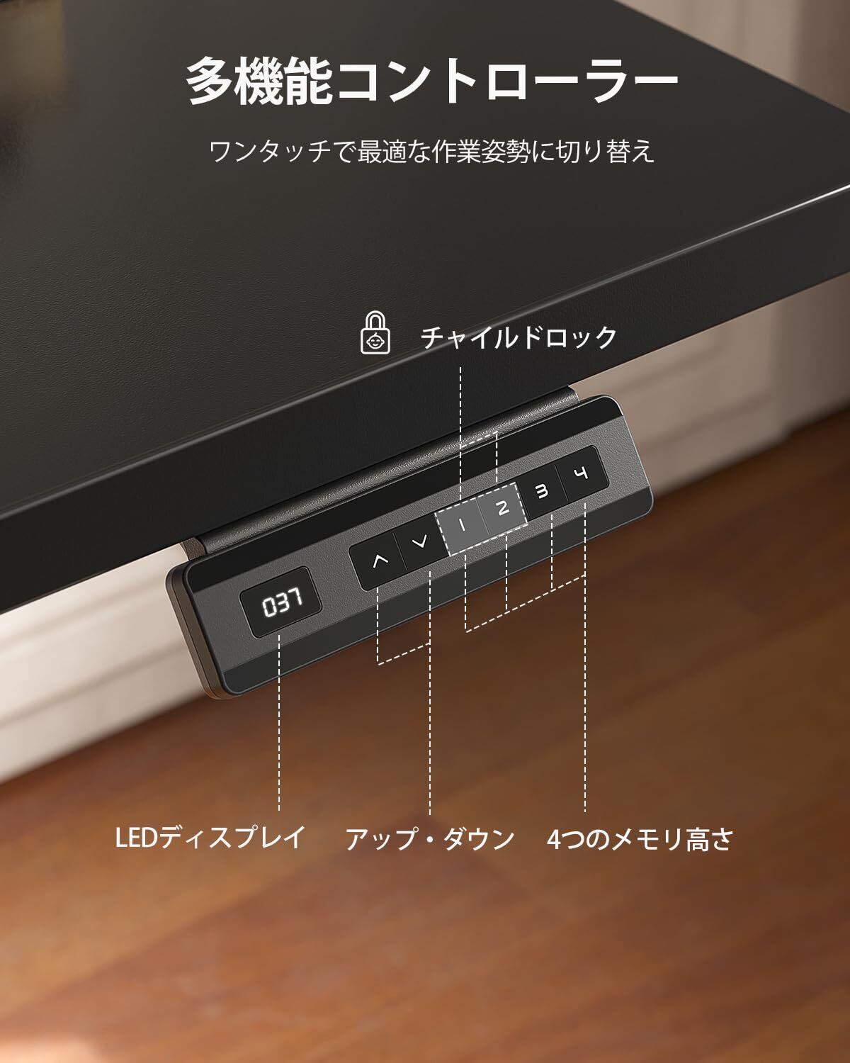 【4つのメモリー機能&チャイルドロック付き手元コントローラー】スタンディングデスクの操作パネルには4つの高さメモリーを登録可能。仕事用・ゲーム用・お子様用など、用途に応じて理想の高さをワンタッチで切り替えられます。さらに、誤操作を防ぐチャイルドロック機能付きで、小さなお子様がいるご家庭でも安心してお使いいただけます。