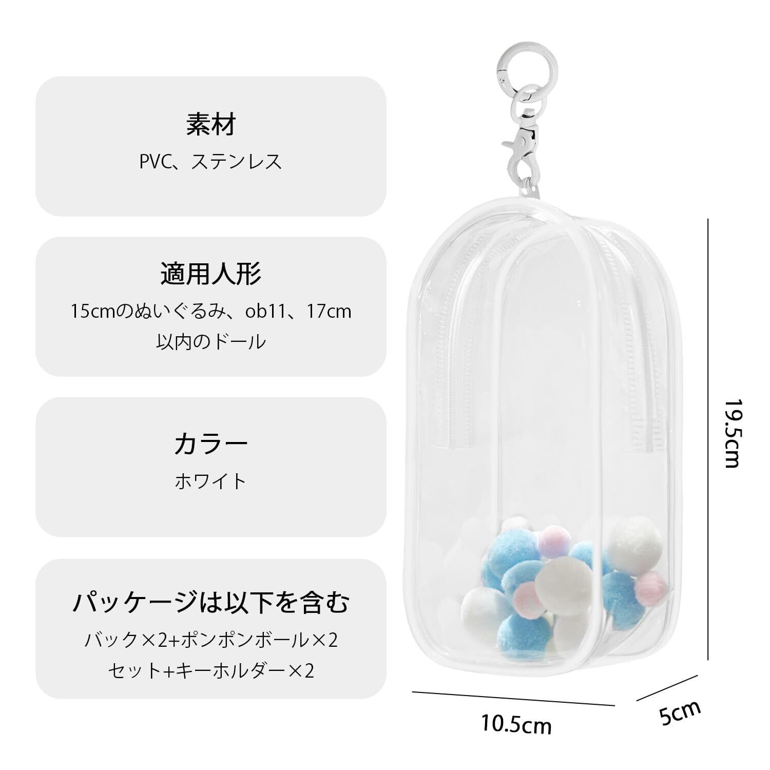【仕様】製品名前:扉形ぬいぐるみバッグ2個(人形なし)。素材:PVC、ステンレス。サイズ:10.5*5*19.5cm。上部幅:10cm。15cmのぬいぐるみ、ob11、17cm以内のドールに適す。*購入する前に人形のサイズを測ってください。パッケージは以下を含む:バック×2+ポンポンボール×2セット+キーホルダー×2。注意:本品はケースのみを含み、ドールの本体に含まれません。ねんどろいどの素材と人形の化粧を保護するため、体とpvc表面の接着を避けるのを注意してください。カラー:ホワイト。