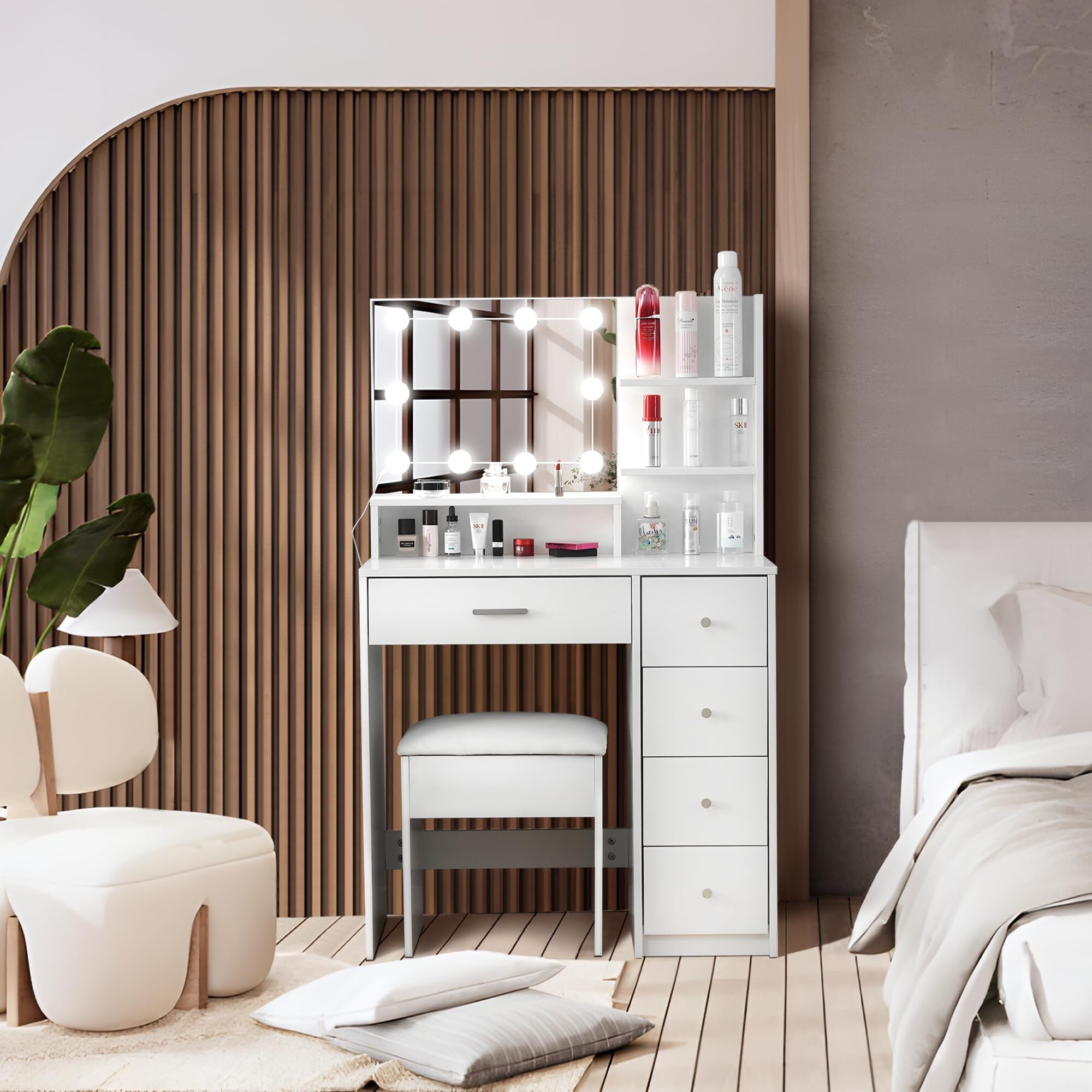 【豊富な収納スペース】独立大収納4箇があって誰にも収納達人になれます。 5つの引き出しと棚が特徴のバニティテーブルセットは、マニキュア、香水、化粧品などを保管するのに十分なスペースを提供します。