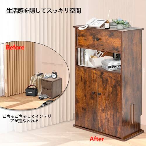 AKOZLIN 電話台 木製 FAX台 ルーター収納 ボックス 引き出し 扉付き コード穴 モデム ケーブル 収納 ファックス台 大容量 幅48×奥行27×高さ83cm ダークブラウン