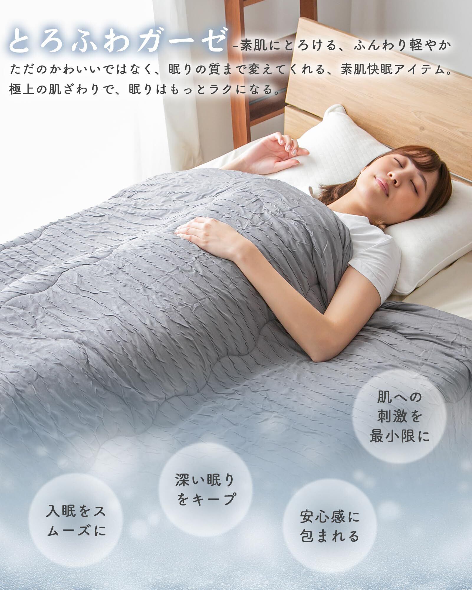 【極上ふわとろ肌触り】中綿は1Dのマイクロエンドレス繊維を使用によって、もちもちの感触があって、布団に入った時に肌触りの心地よさを実感しています。一日中働いた方はふわとろの布団に包み込まれる瞬間に、疲れも解消されたようだ。
