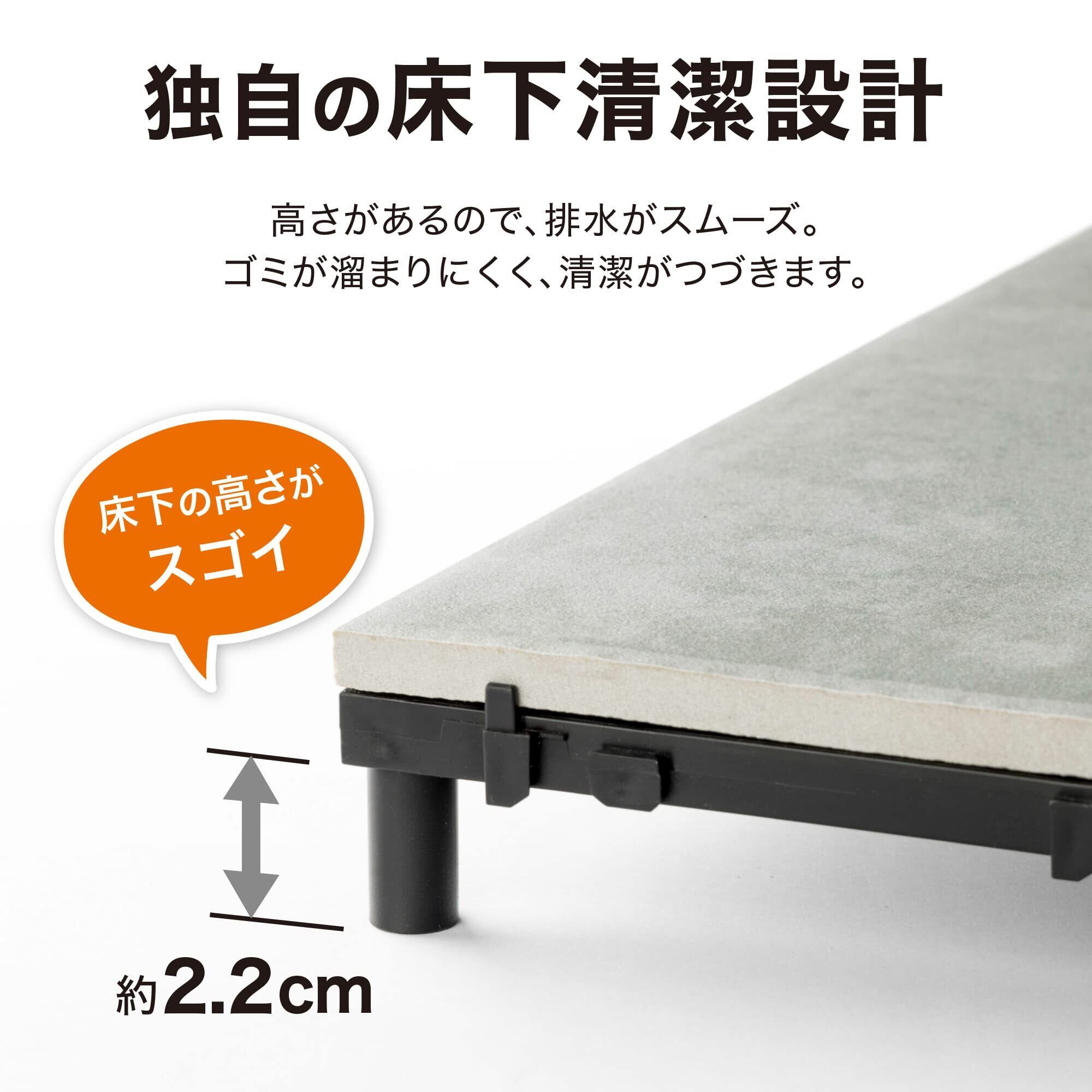独自の床下清潔設計。ベースアップ敷くだけシリーズは、床下の約2.2cmの高さがあるので、排水性が抜群。ゴミが溜まりにくく、清潔がつづきます。