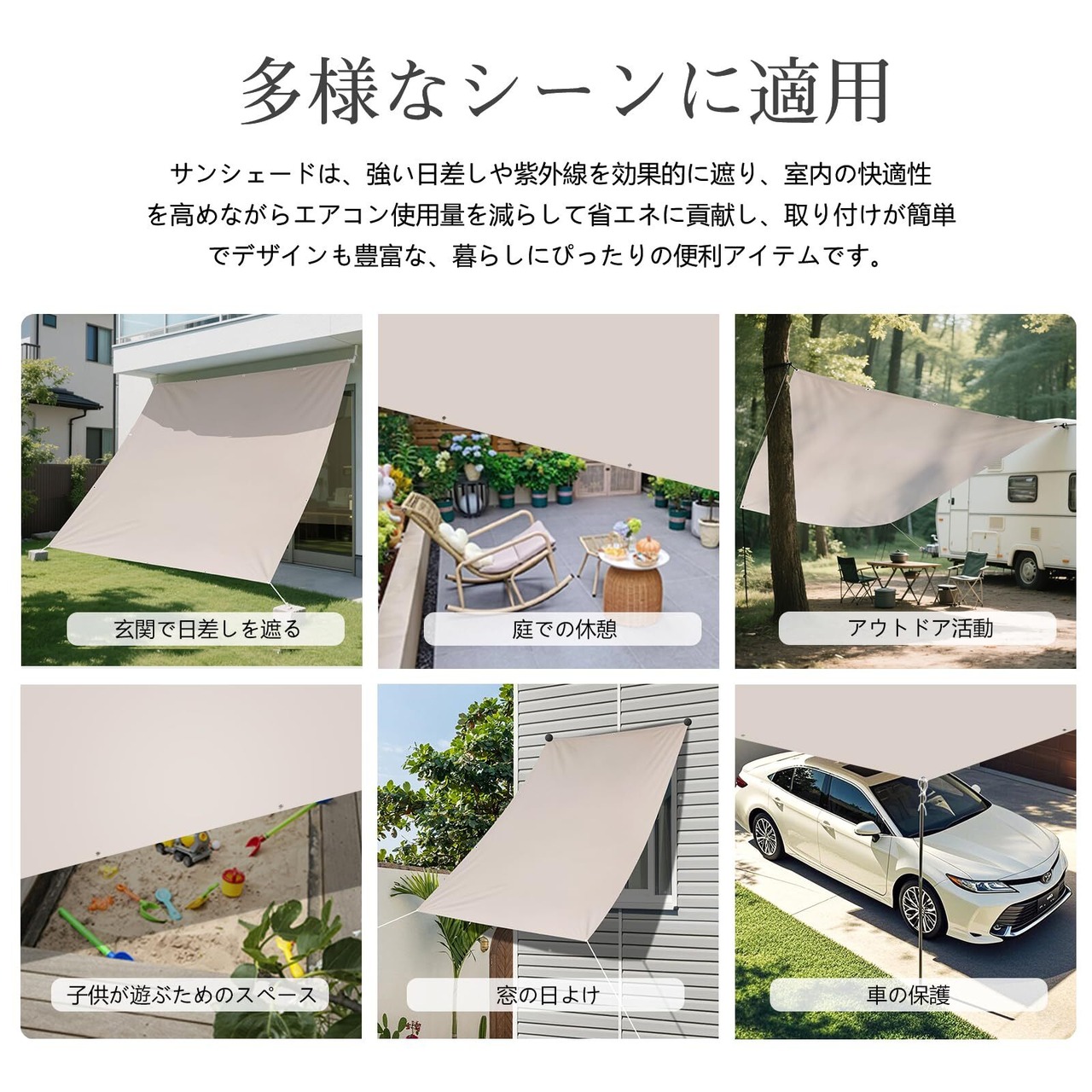 錆びないのゴールデンアルミハトメが付いているので、付属品:6本x1.5m取付けひも、ベランダや窓ペ、廊下、庭下、庭先、玄関などに簡単に取り付けることができます。お洒落なデザインなので、日よけだけでなく、ご自宅やお庭のエクステリアとしてもご利用なれます。