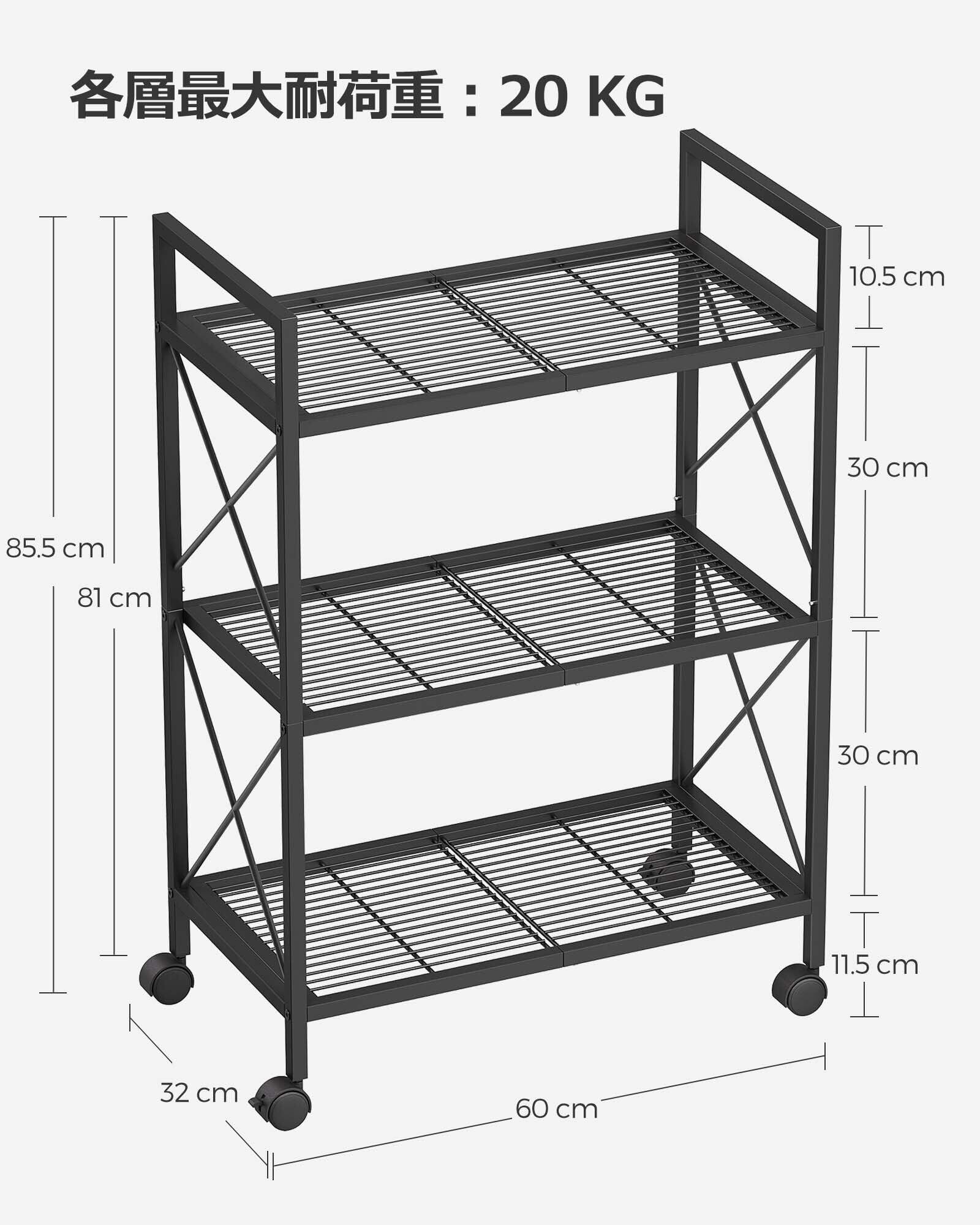 SONGMICS スチールラック 3段 幅60 キッチンワゴン キャスター付き 棚 ラック 幅60 メタルラック キッチンラック 収納ラック オープンラック耐荷重60KG アイアンラック 収納棚 大容量 整理棚 すき間収納 60x32x85.5CM BSC163B01